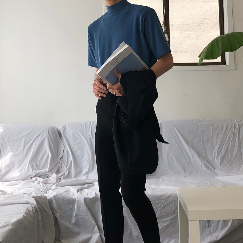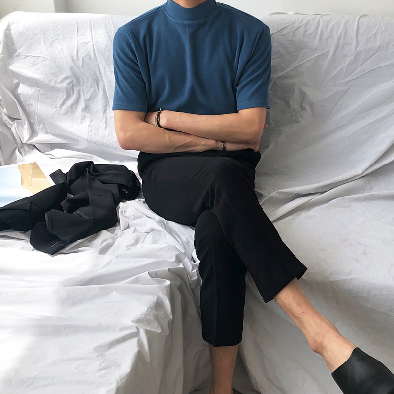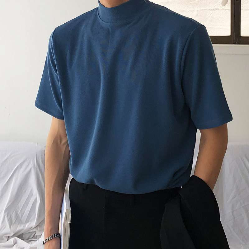 夏季半高领纯色短袖t恤男棉潮牌宽松港风半袖打底衫韩版潮流体恤