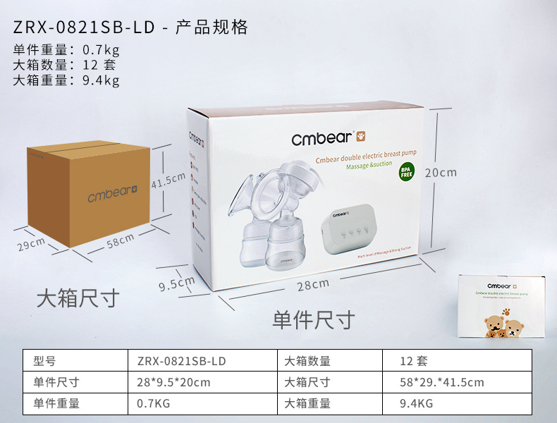 跨境批发卡曼熊全新电动双边吸奶器充电款多档模式调节母婴用品