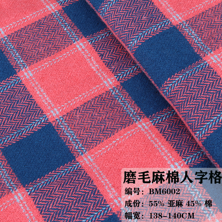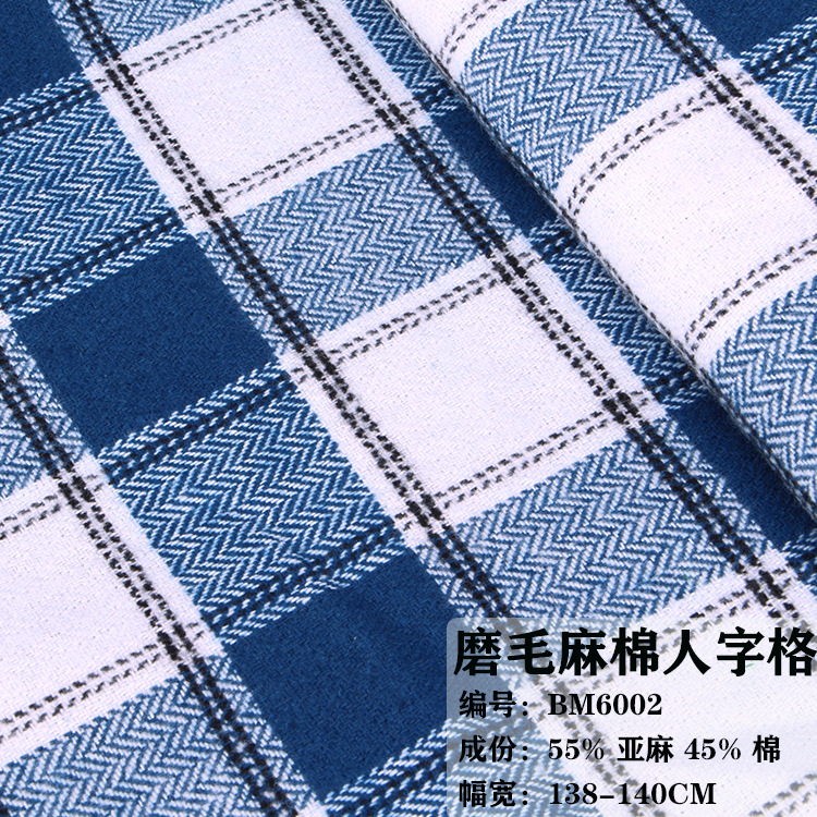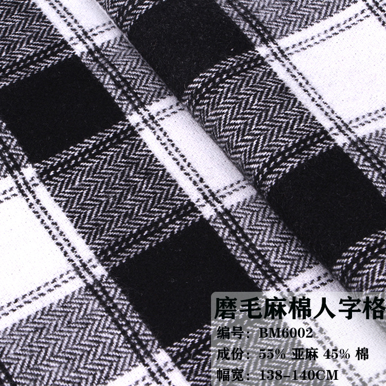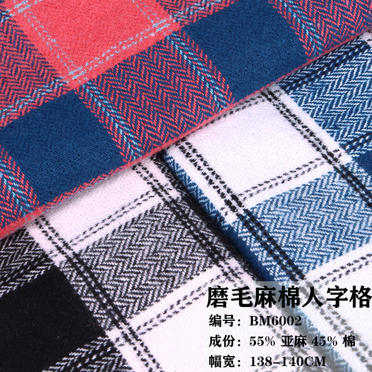亚麻棉人字斜纹色织磨毛格子布料 秋冬时装鱼骨纹棉麻格子面料