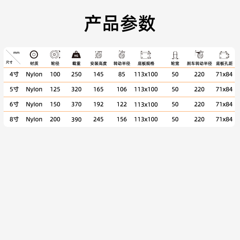 奔宇厂家重型尼龙脚轮固定轮万向轮刹车轮4568寸手推车平板车