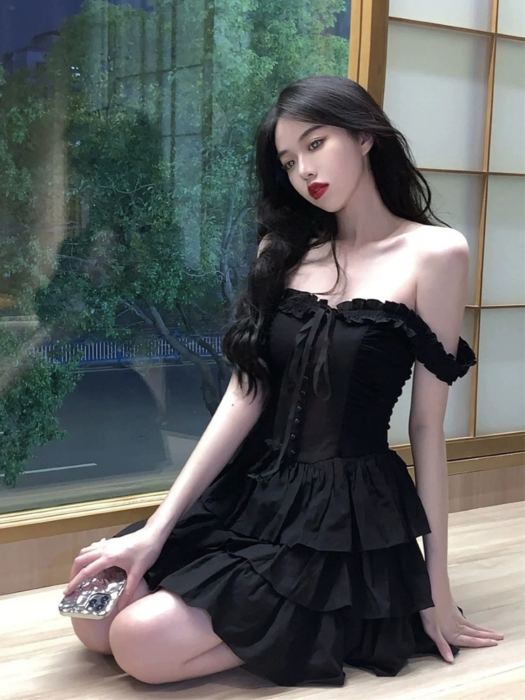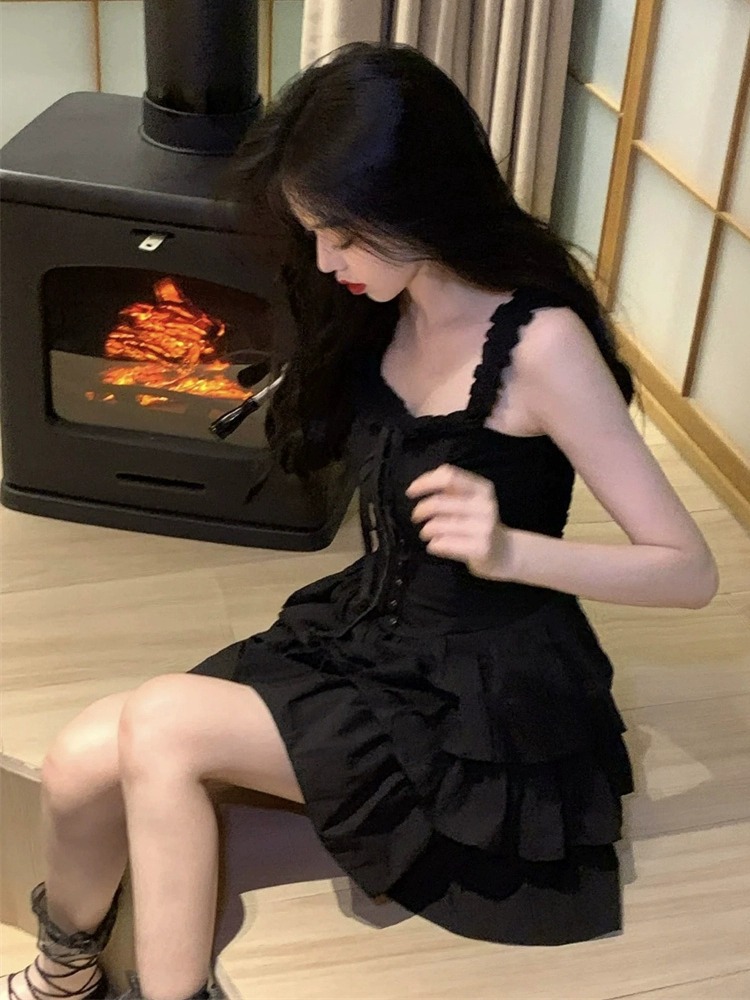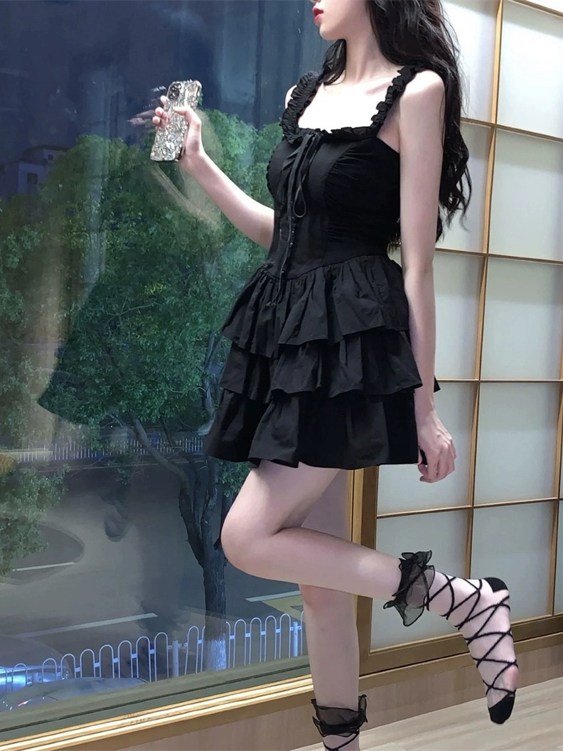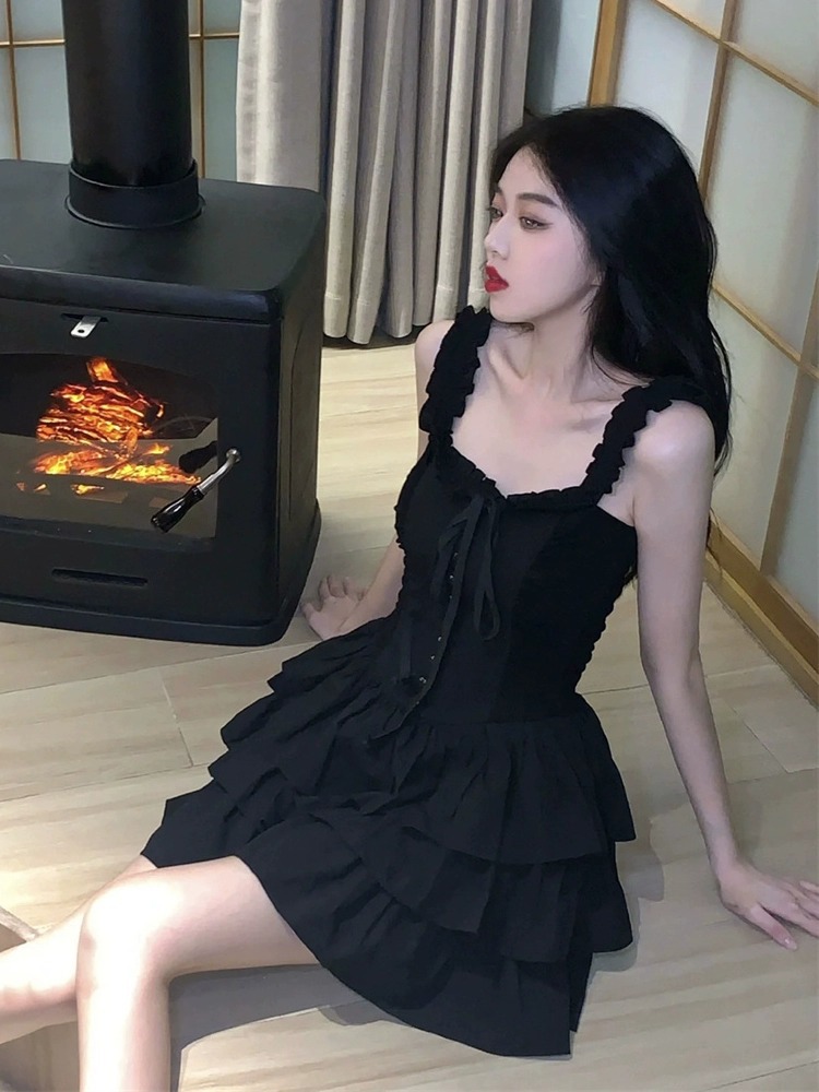 赫本风黑色木耳边吊带连衣裙夏季性感小个子绑带收腰荷叶边蛋糕裙