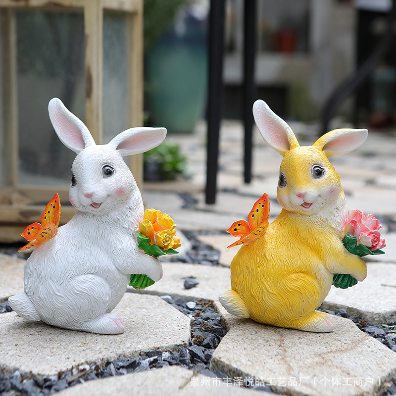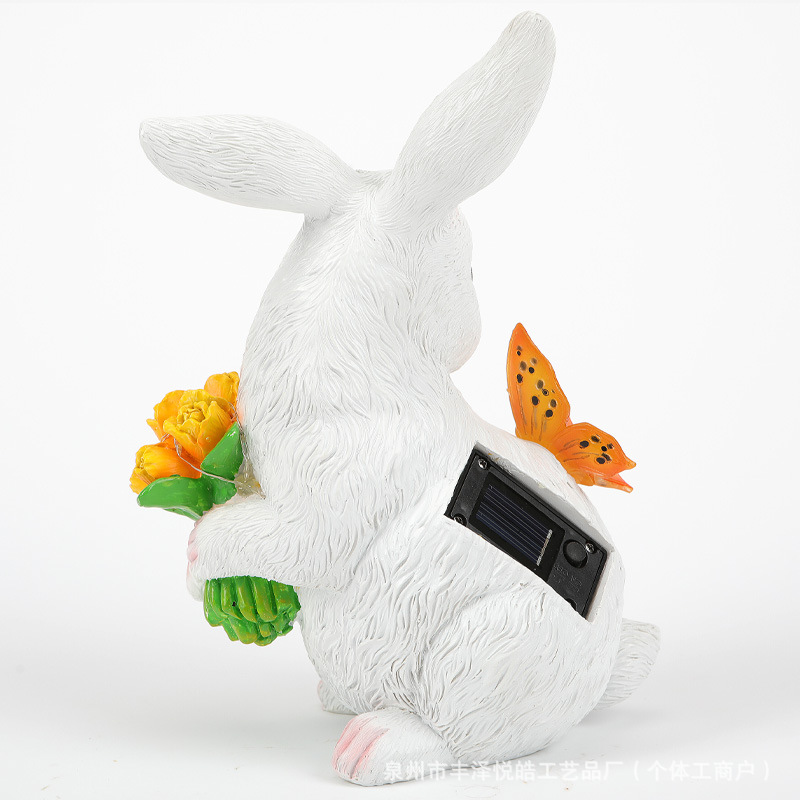 跨境户外太阳能卡通蝴蝶兔子抱花树脂工艺品动物花园阳台装饰摆件