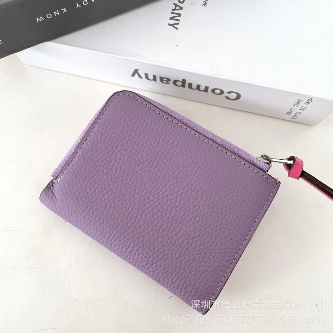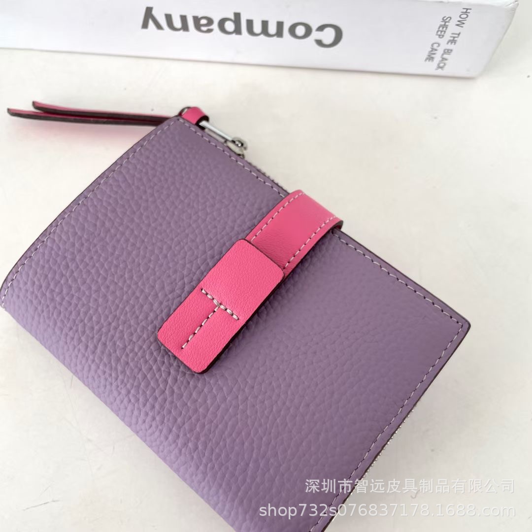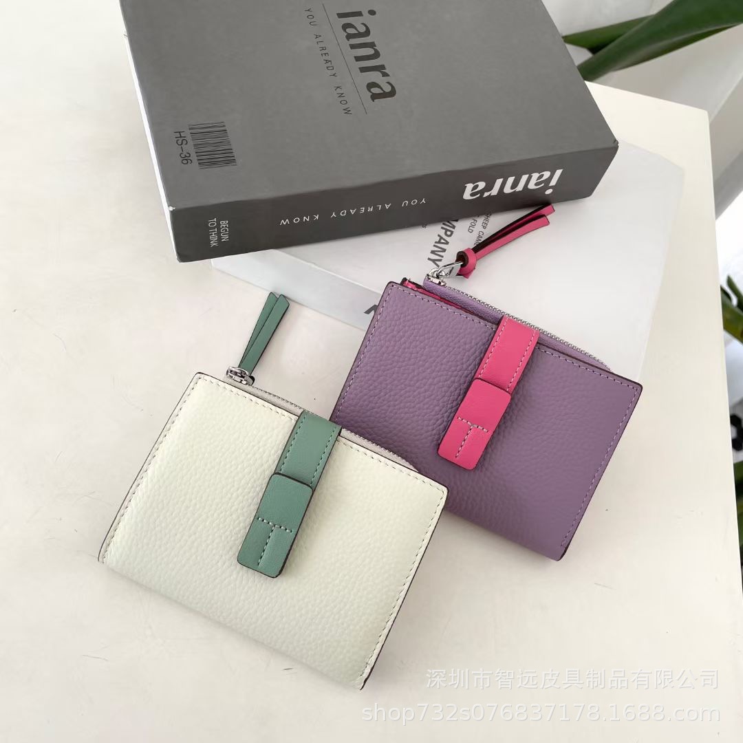 日本真皮荔枝纹小钱包女短款撞色头层牛皮二折多功能抽带搭扣钱夹