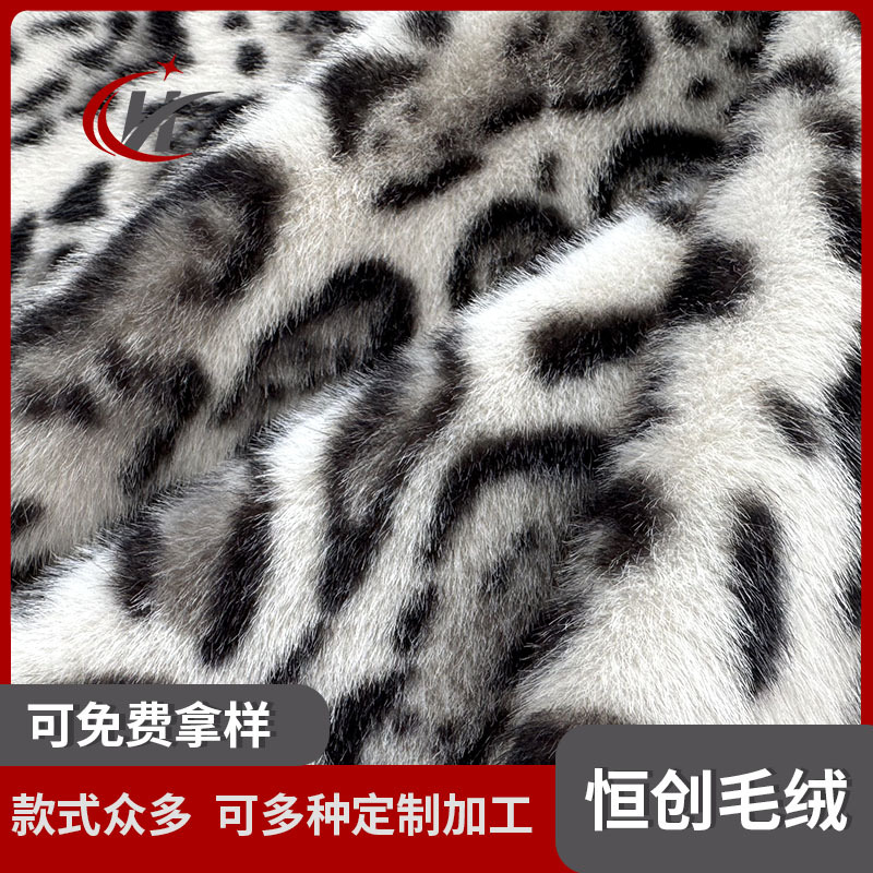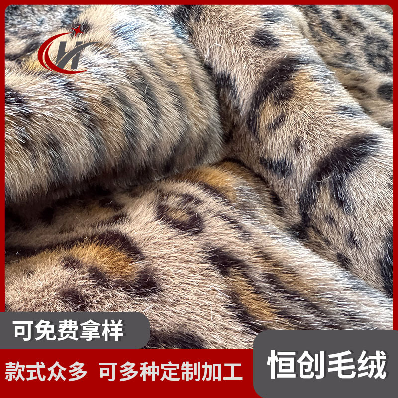 新款印花秋冬针织面料 牛角豹纹涤纶动物印花仿水貂毛绒布面料