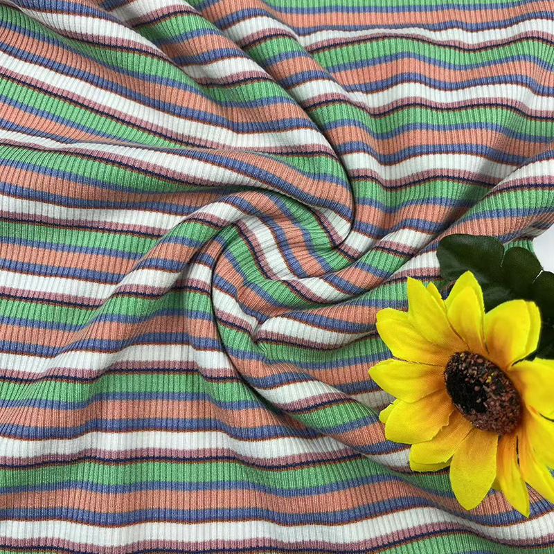 现货批发春夏休闲服T恤针织面料 TR罗纹汗布彩条色织针织罗纹布料