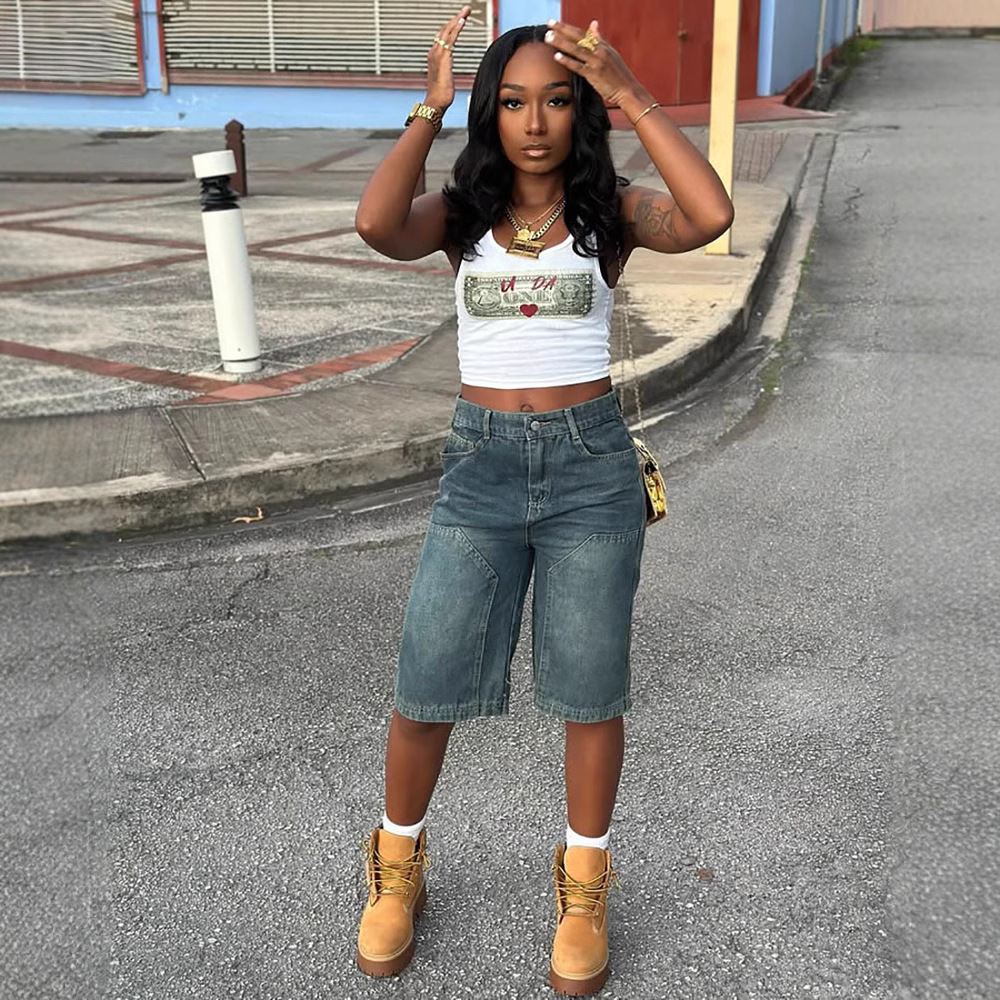 欧美跨境女装亚马逊女式休闲牛仔裤夏季复古宽松水洗直筒牛仔短裤