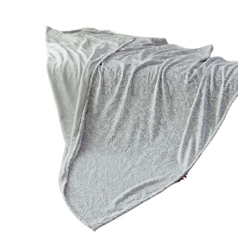 跨境欧式绒毯背印剪花法兰绒毯封边灰色花纹盖毯办公室午休毯批发