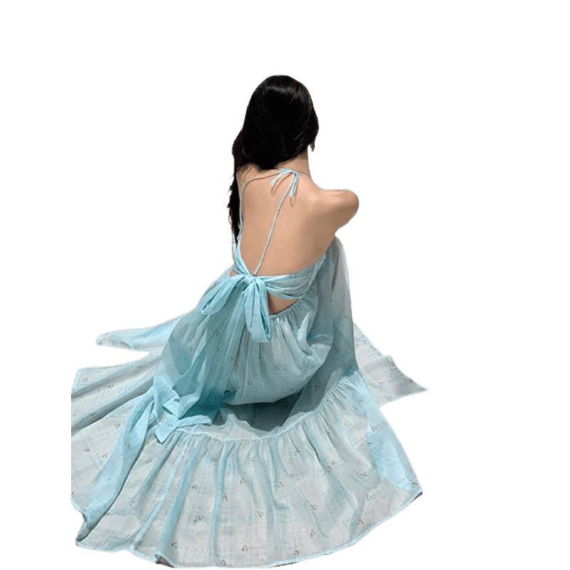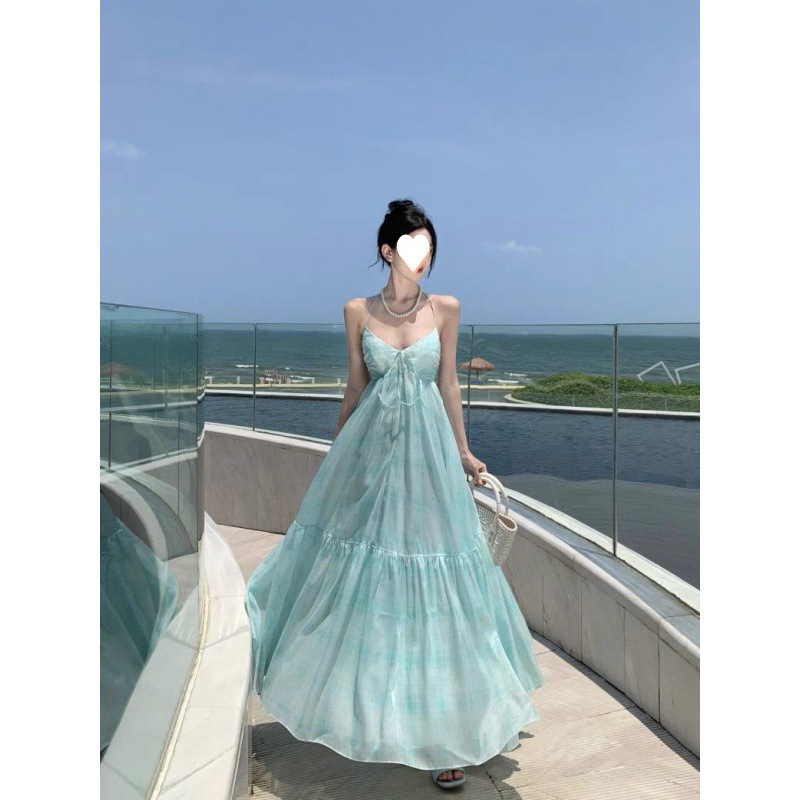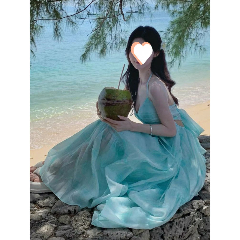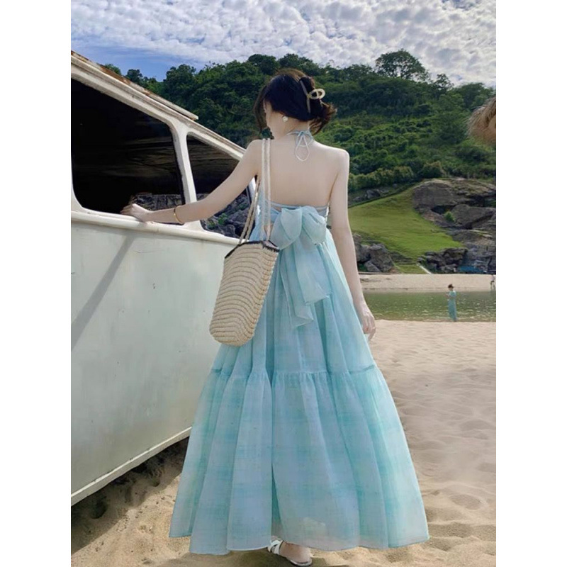 三亚沙滩度假连衣裙女蓝色度假裙海边沙滩吊带裙性感露背长裙夏