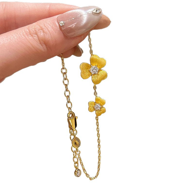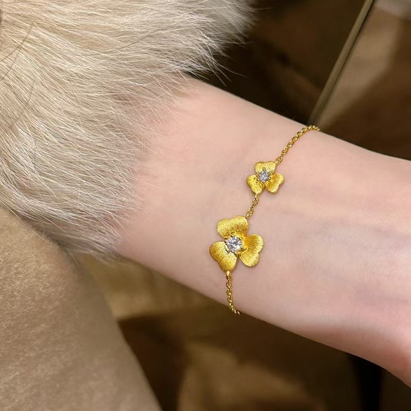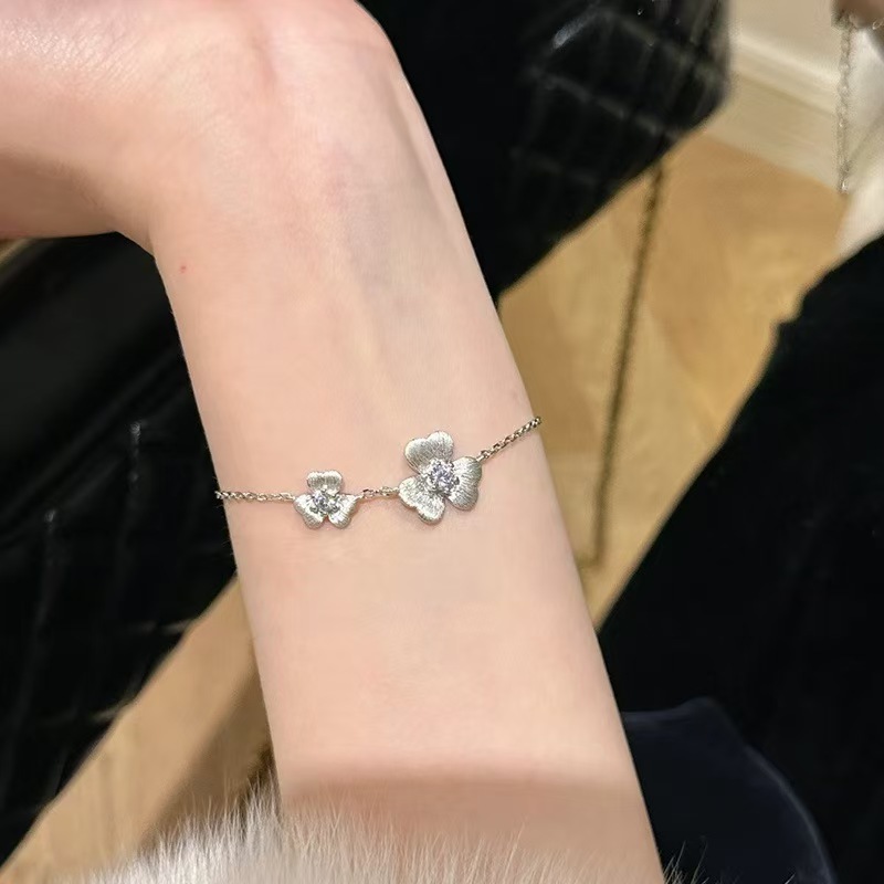 小红书爆款S999纯银复古法式拉丝三叶花手链闪钻轻奢高级感气质