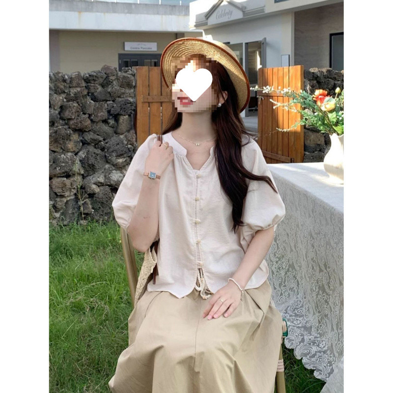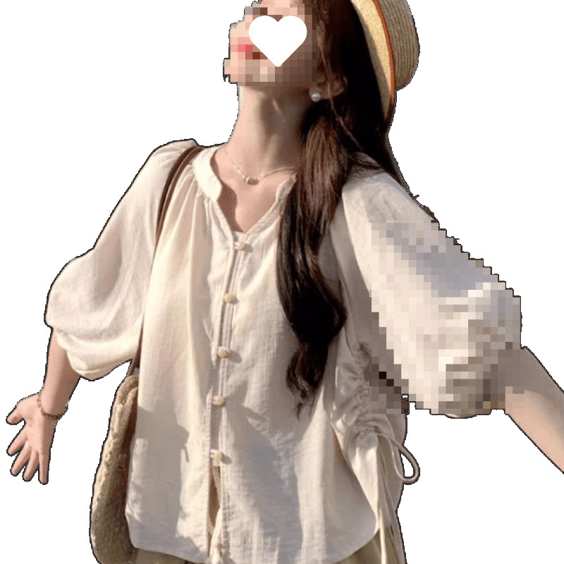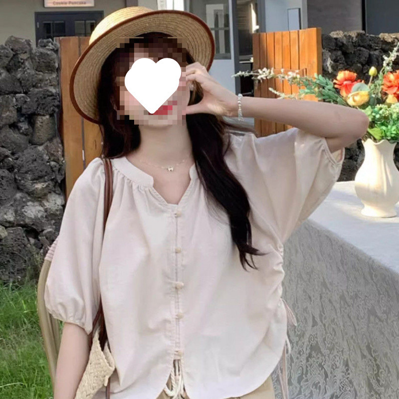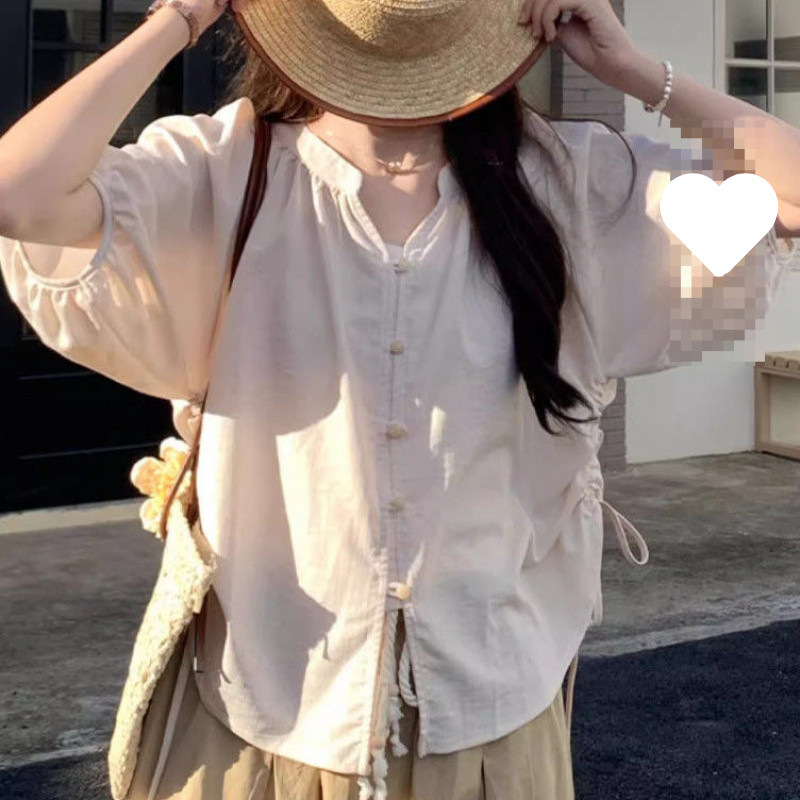 M8N法式甜美抽绳褶皱灯笼袖衬衫女2025夏季新款大码透气