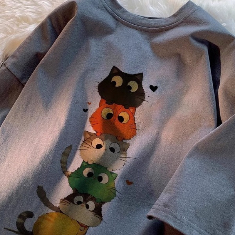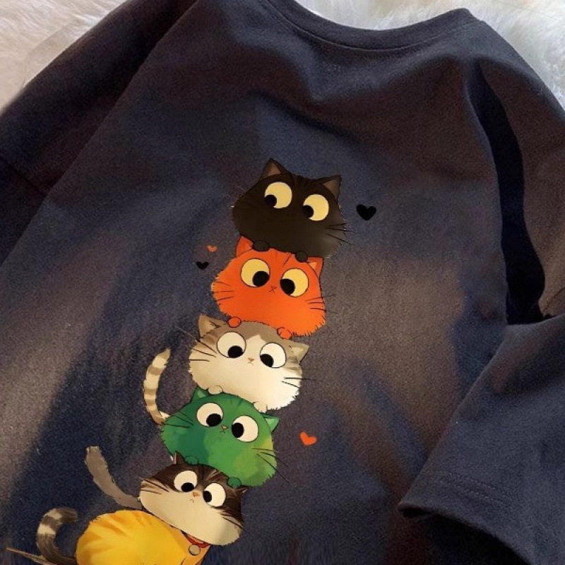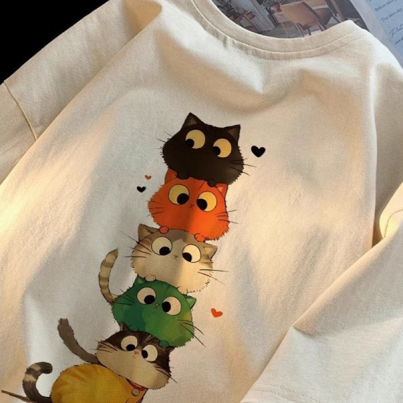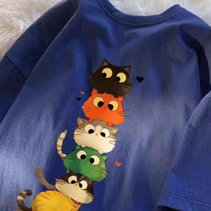 纯棉可爱猫咪小个子短袖T恤2025男女潮牌百搭宽松显瘦遮肚子上衣