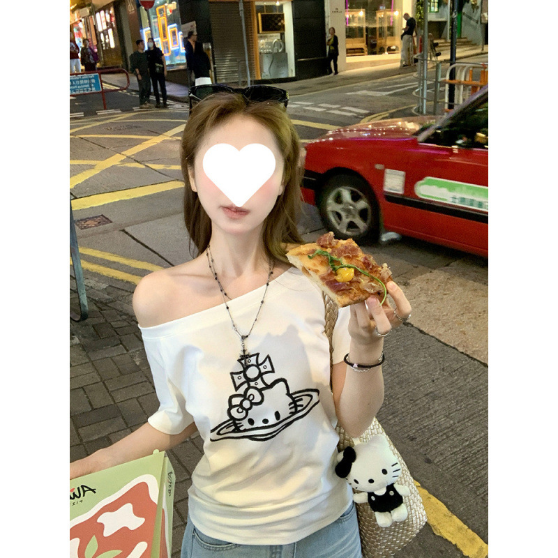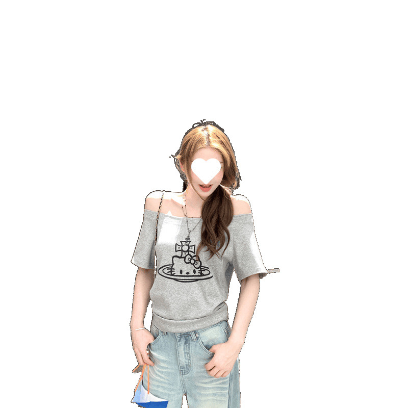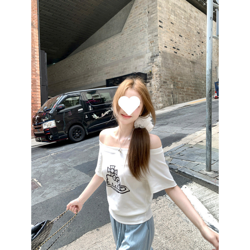 精棉松弛具象 斜肩印花短袖露肩恤