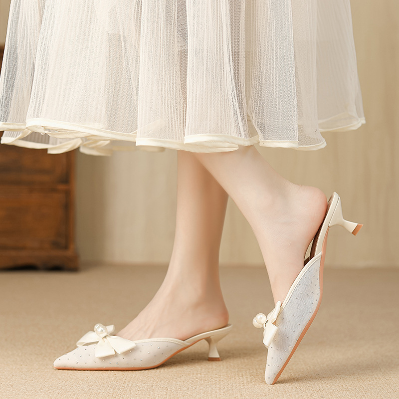 千履汇 度假风可外穿包头凉拖鞋细跟尖头网纱蝴蝶结甜美风穆勒鞋