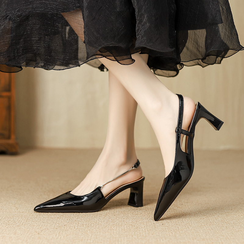 千履汇 都市白领职业通勤粗跟尖头气质凉鞋金属链条时尚漆皮女鞋