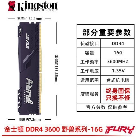 金士顿Beast野兽骇客神条DDR4 台式机电脑四代内存条3600单条适用