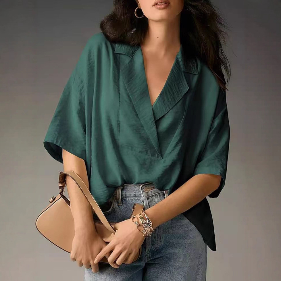 2025亚马逊欧美外贸女式夏季新款短袖翻领休闲宽松上衣纯色衬衣