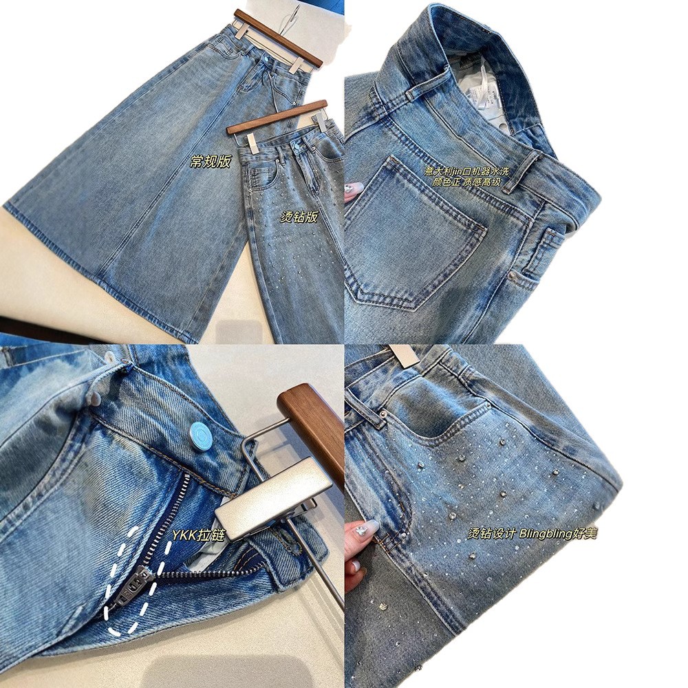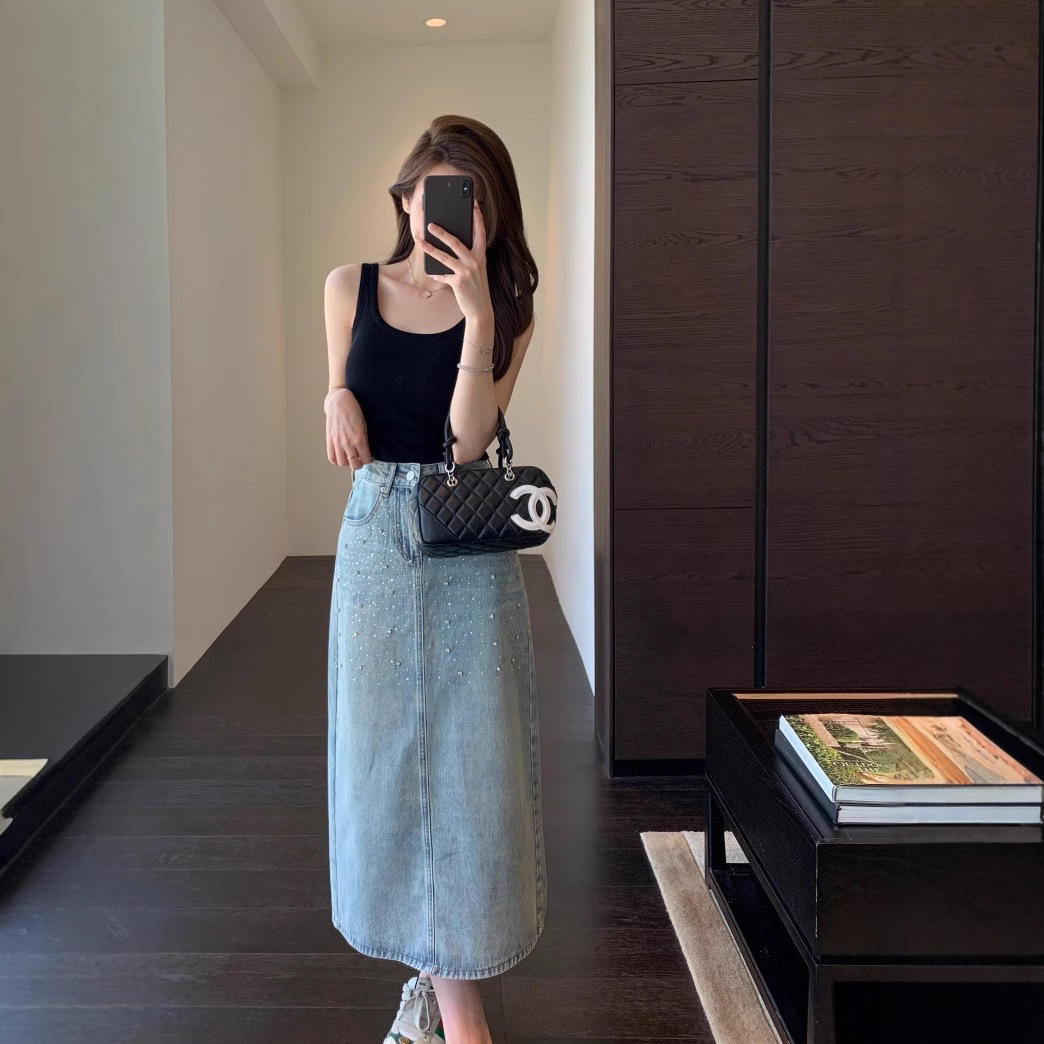 高级感烫钻牛仔半身裙显腿长高腰A字开叉长半身裙女2025春夏新款