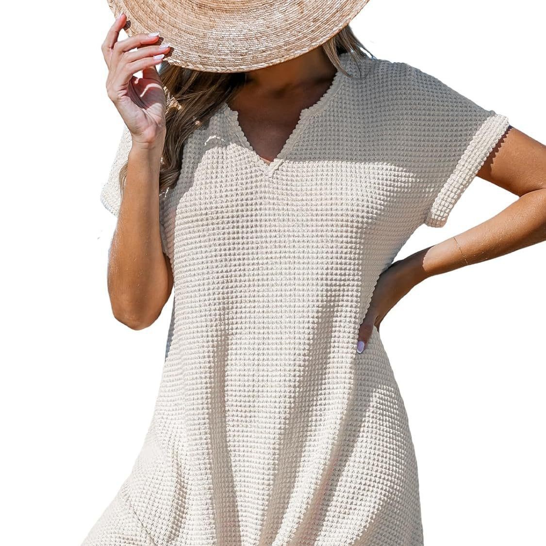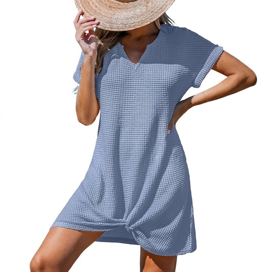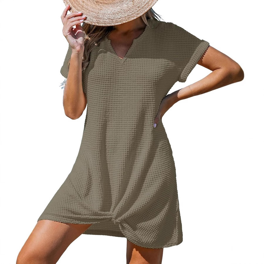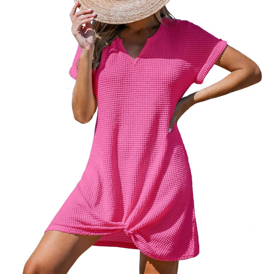 2025欧美跨境热卖女装 春夏新款沙滩防晒裙休闲V领扭结罩衫连衣裙