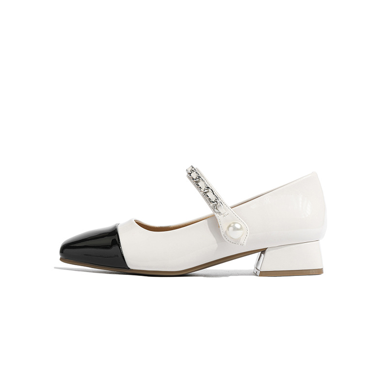 尚案 梦回赫本经典小香风漆皮玛丽珍鞋粗跟方头珍珠一字带高跟鞋