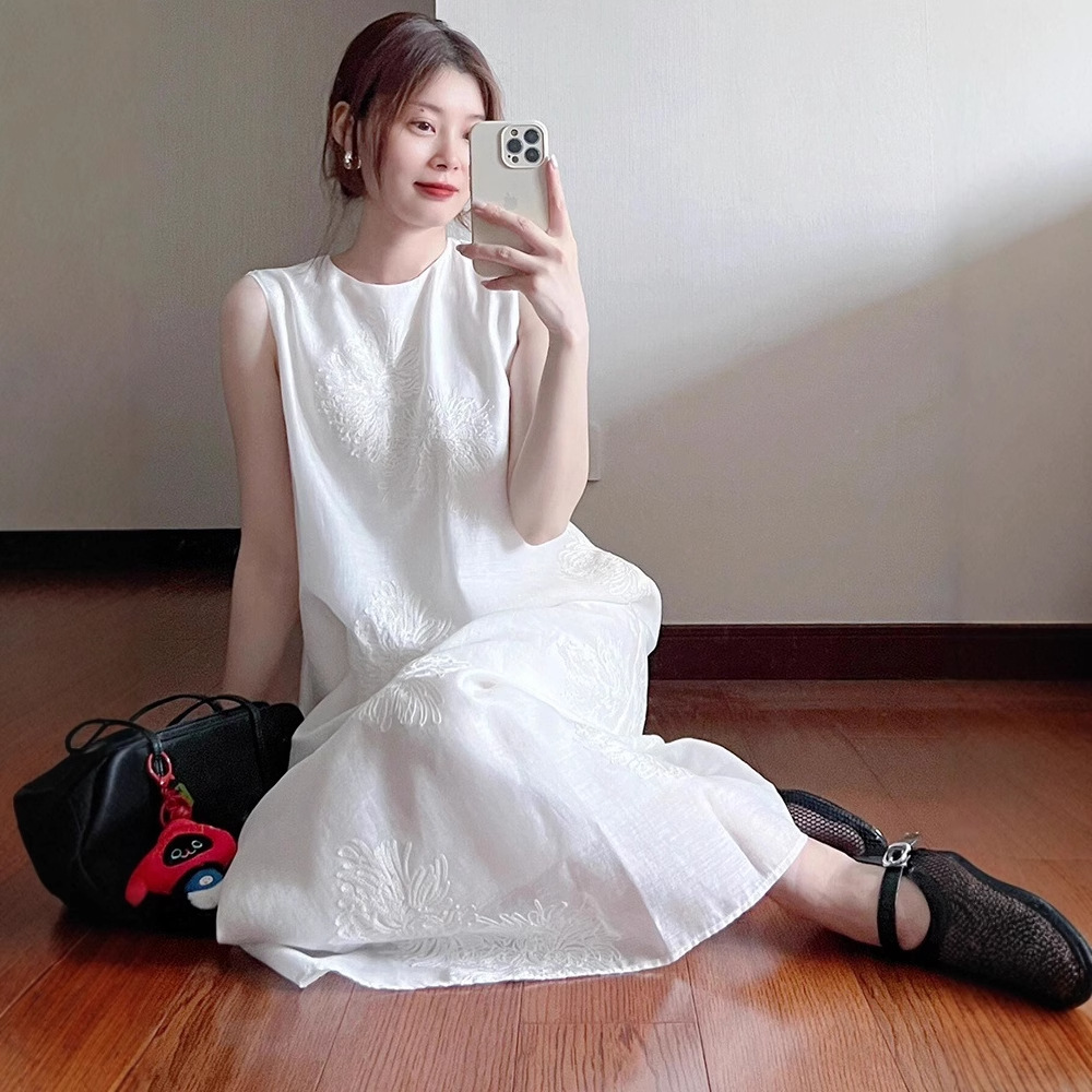 博主同款醋酸亚麻刺绣白色连衣裙新中式国风无袖长裙夏季