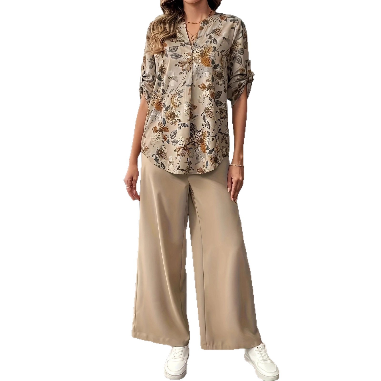 欧美跨境卡其色印花阔腿松弛休闲套装