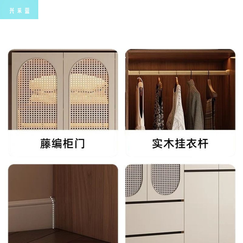 卧室家用分段式一门到顶实木简约现代新中式中古藤编法式复古衣柜