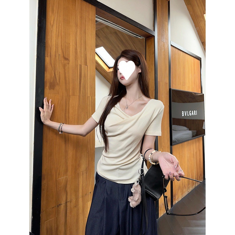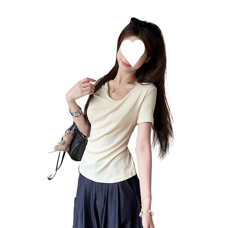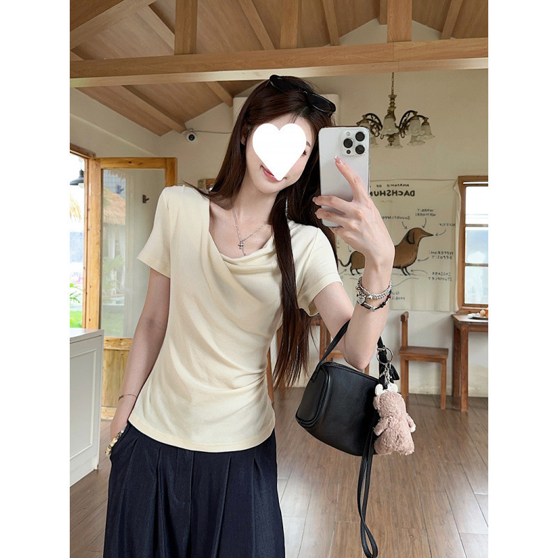 跨境实拍短袖T恤夏2025新款设计感简约纯色修身短款荡领上衣韩版