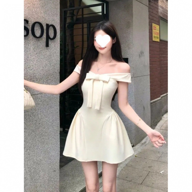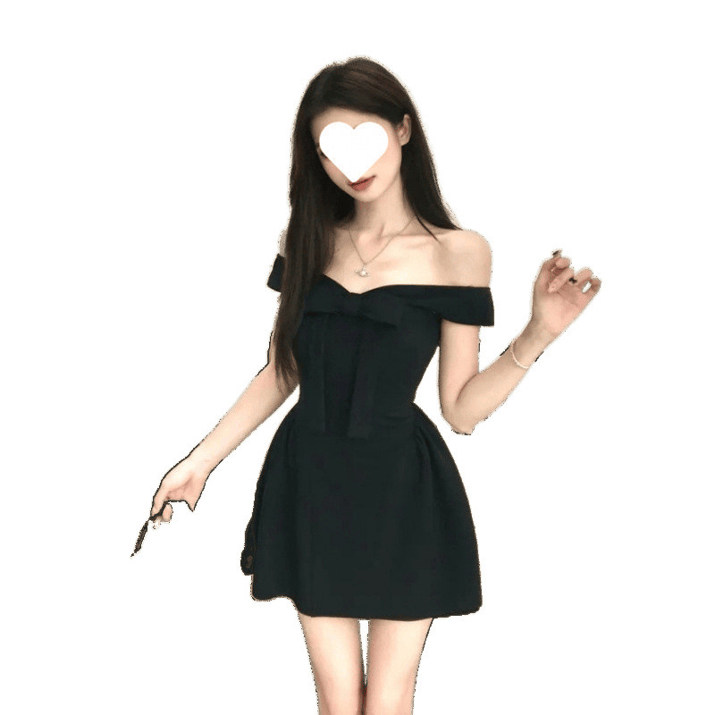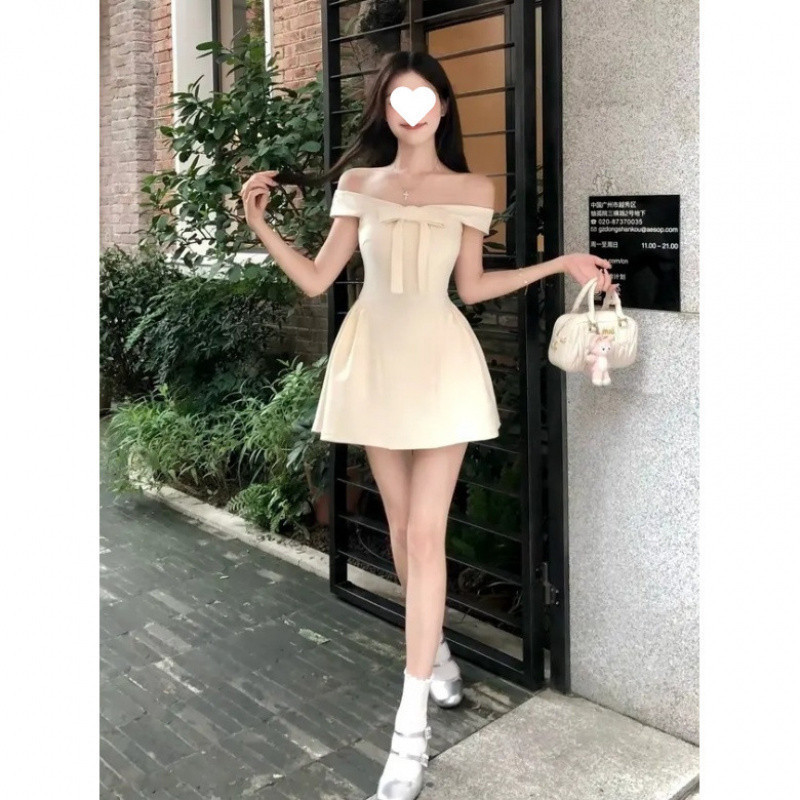 跨境云柔漫步 设计感蝴蝶结一字肩连衣裙女夏季新款收腰显瘦字短
