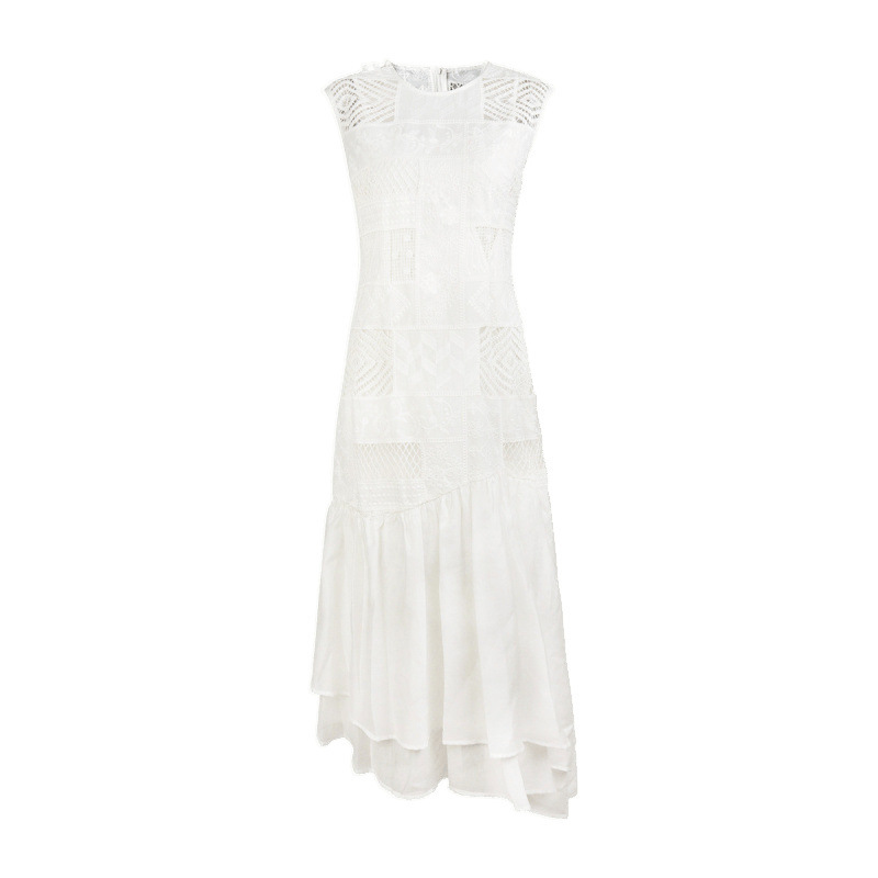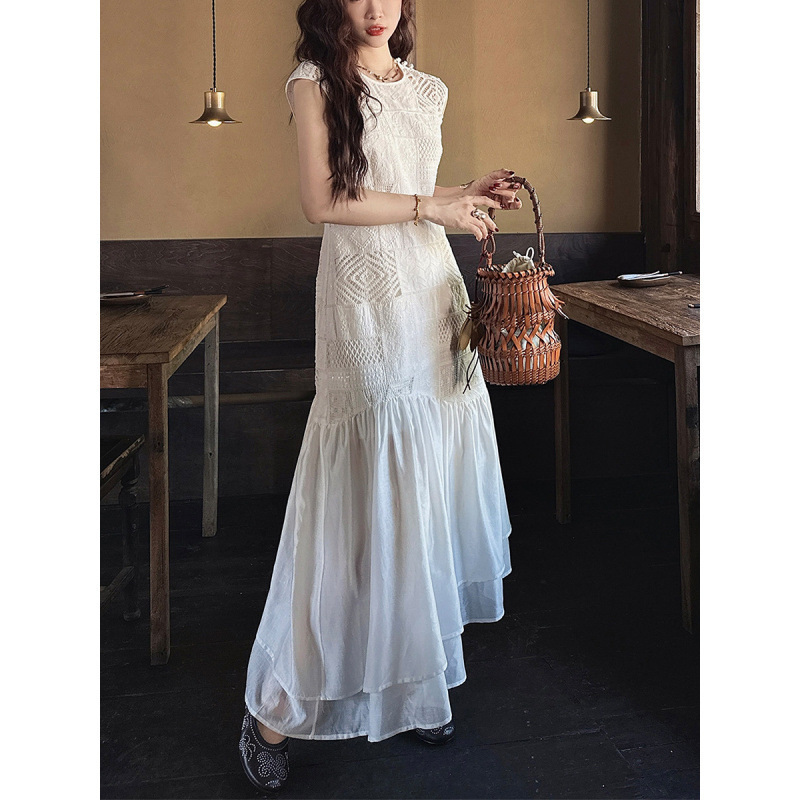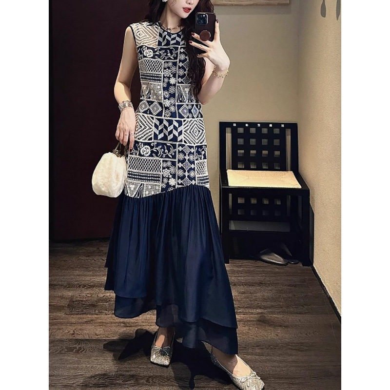 跨境连衣裙子新今年流行初夏穿搭漂亮掐腰裙藏青玉白棉镂空长
