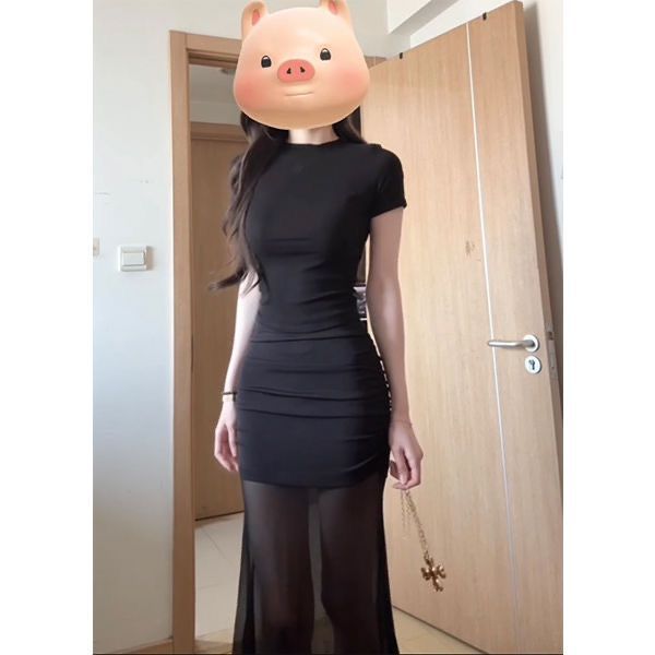 跨境黑色网纱拼接连衣裙女装夏季新款设计感小众辣妹气质修身包臀