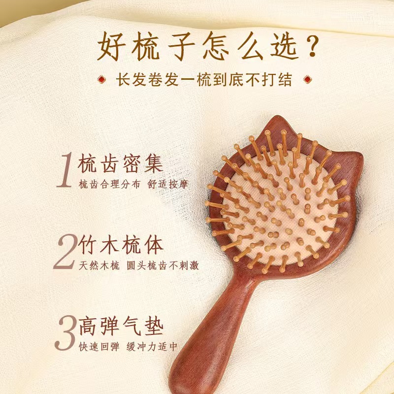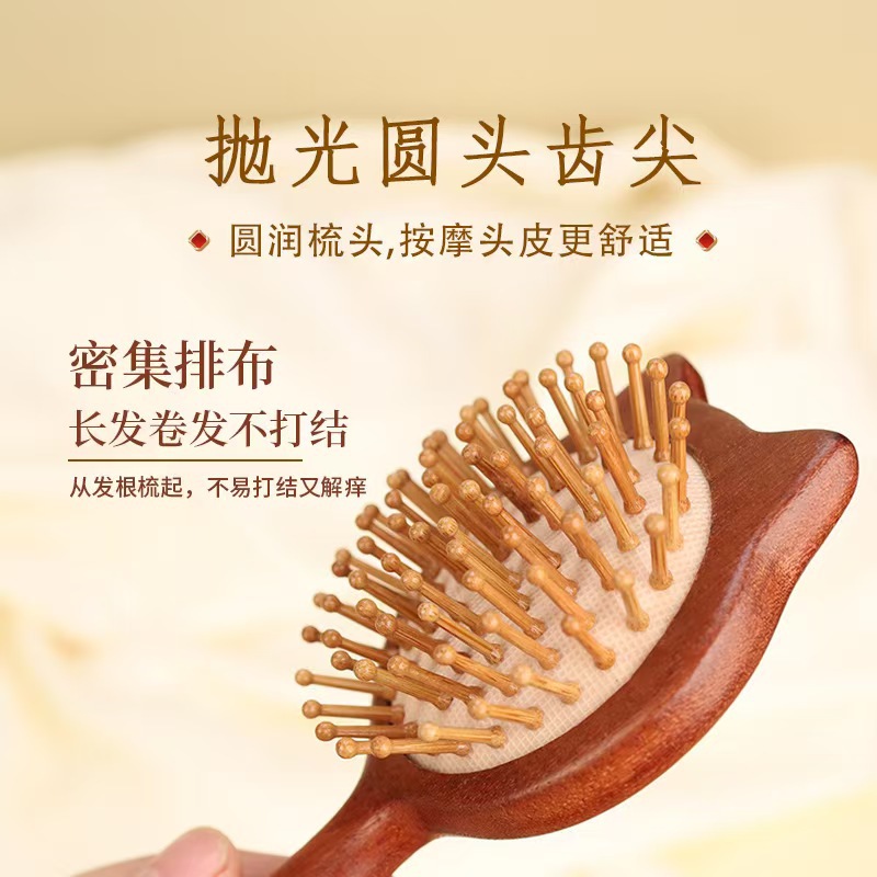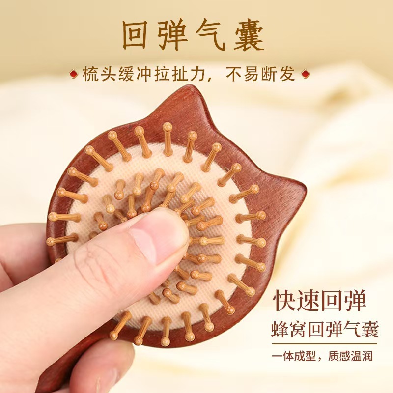 邢粮木艺红檀香木气垫梳可爱小猫气囊梳子实木按摩梳头部经络梳