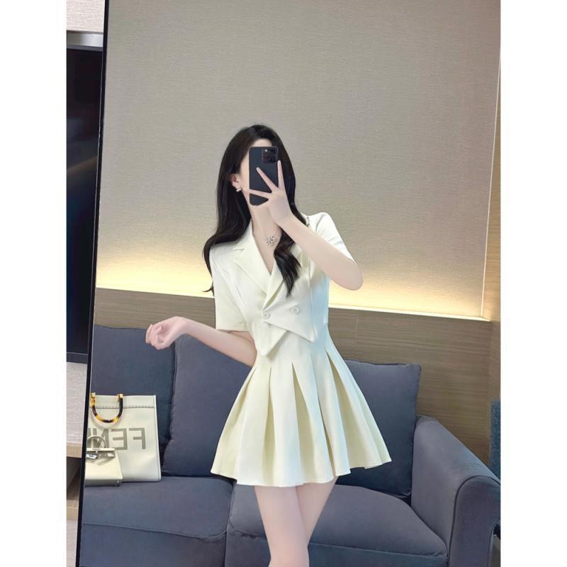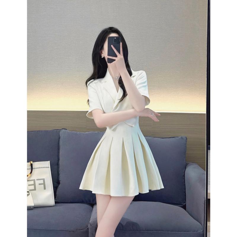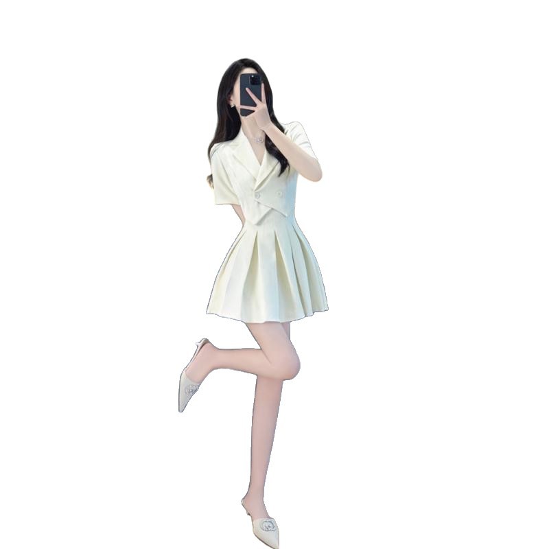 跨境西装连衣裙女夏2025新款感气质名媛收腰甜美假杏色纽扣纯