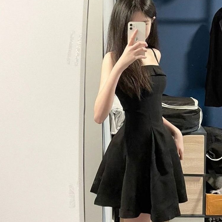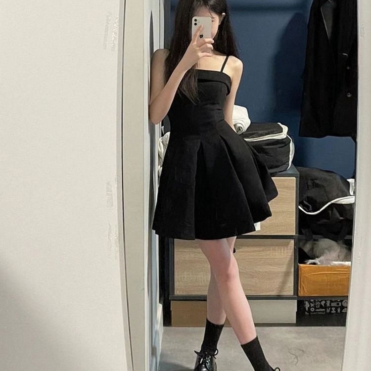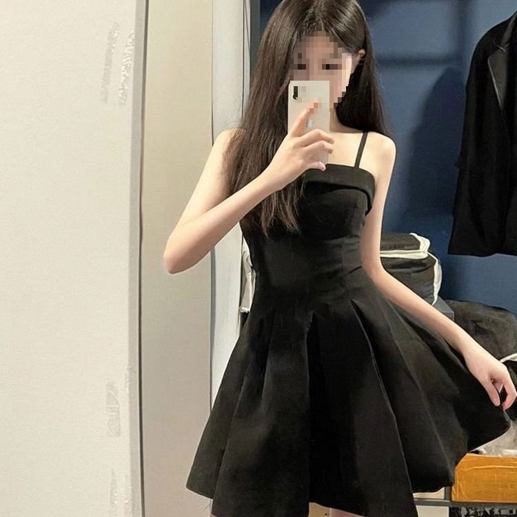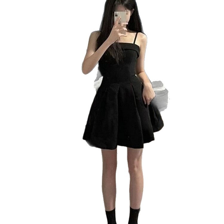 跨境2025新款法式赫本黑色吊带连衣裙气质收腰显瘦短裙小黑裙