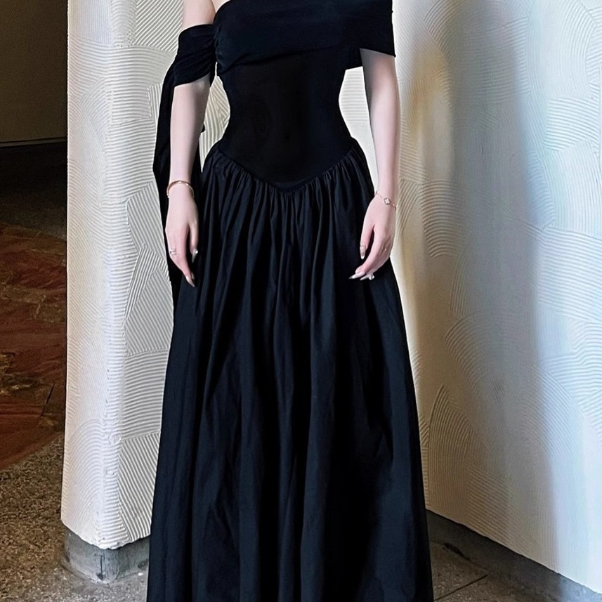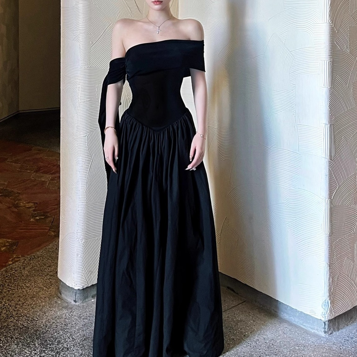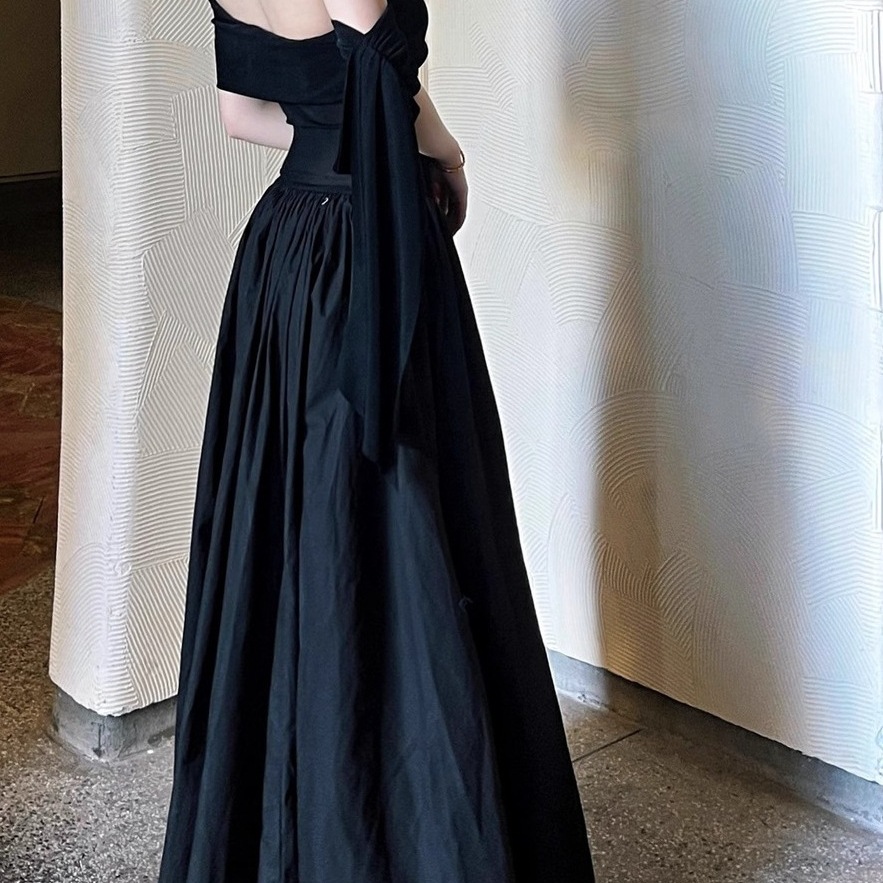 跨境T|法式赫本风一字肩飘带大裙摆黑色连衣裙女夏显瘦气质御姐