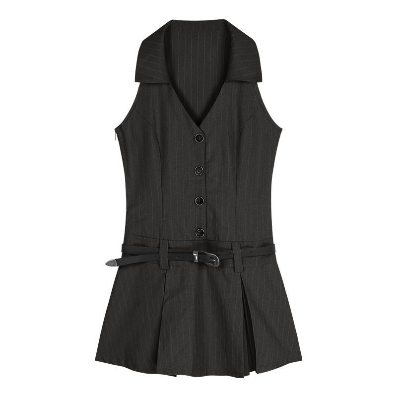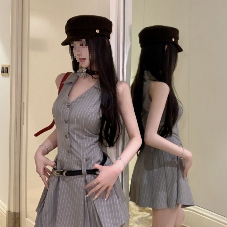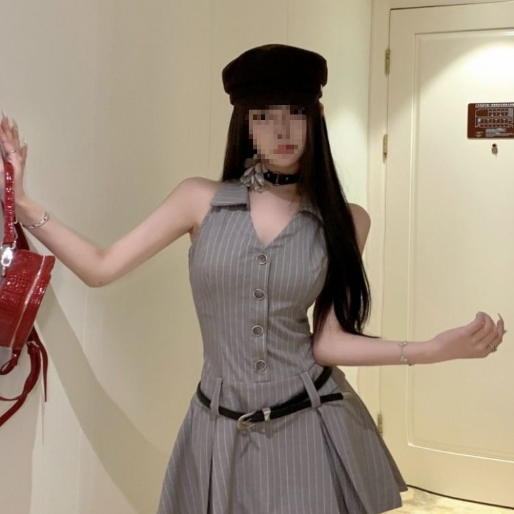 跨境复古灰色翻领挂脖连衣裙女装夏季学院风西装百褶裙无袖收腰短