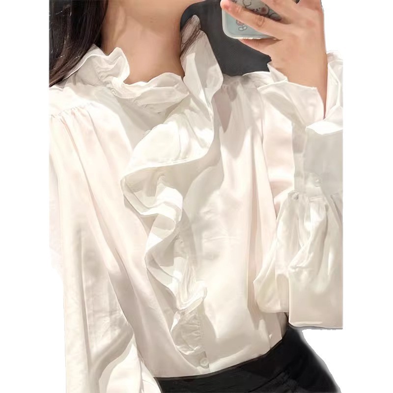 跨境女装2025春季新款设计感小众法式复古荷叶边立领白色长袖衬衫