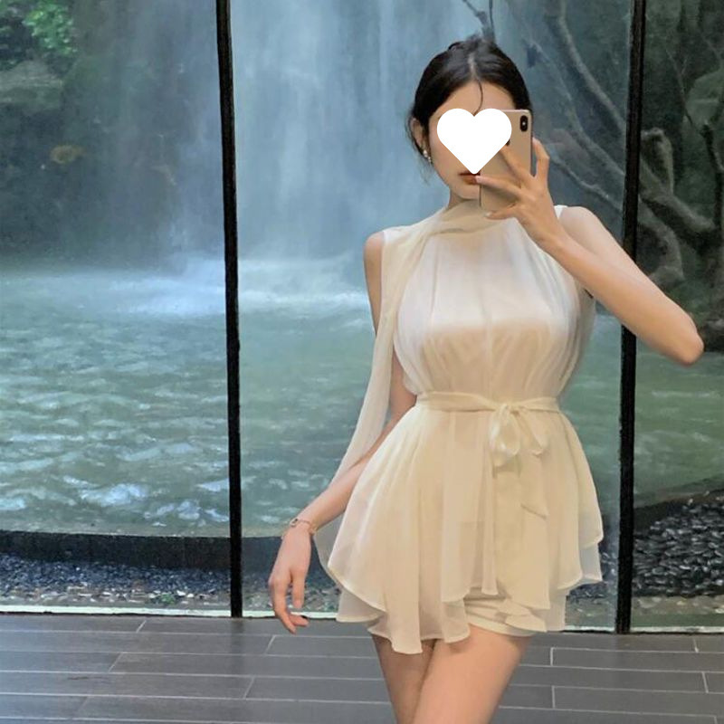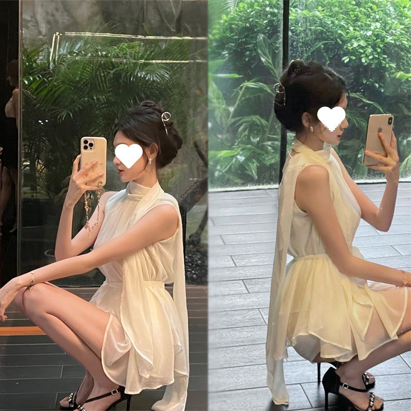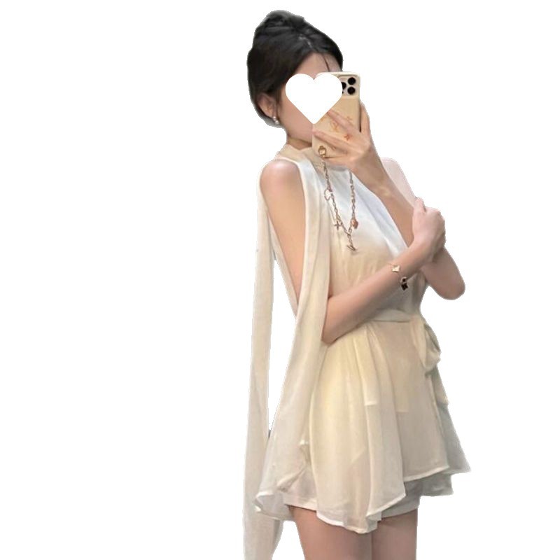 跨境飘带无袖气质雪纺衫女2025夏季新款辣妹纯欲宽松米白色非洲简