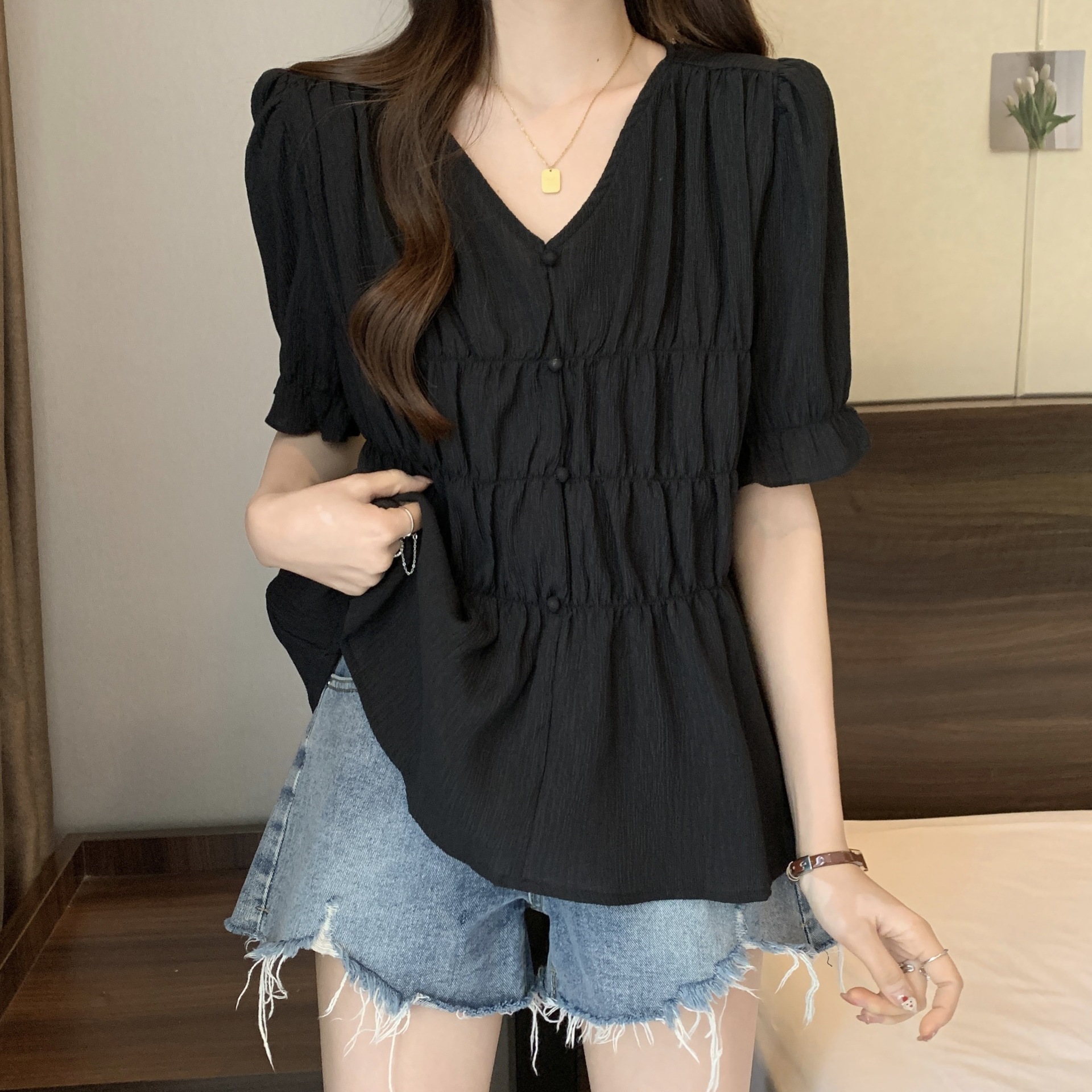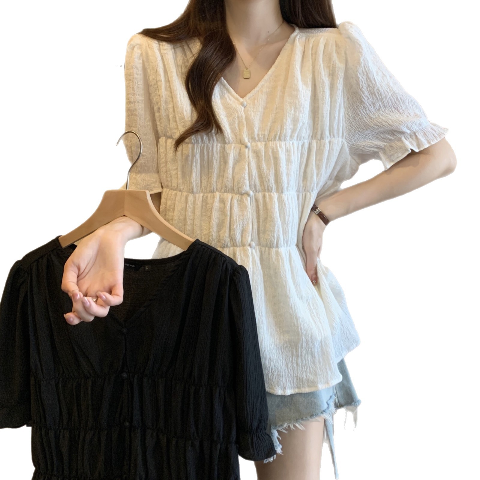 跨境胖MM大码女装黑色衬衫2025夏短袖显瘦法式上衣荷叶边遮肉V领