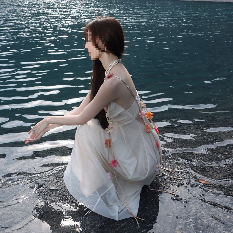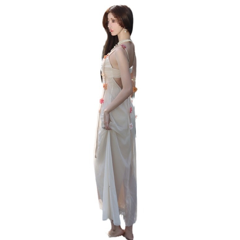 跨境高腰显瘦吊带连衣裙女夏季海边度假一字领无袖沙滩长裙图色东