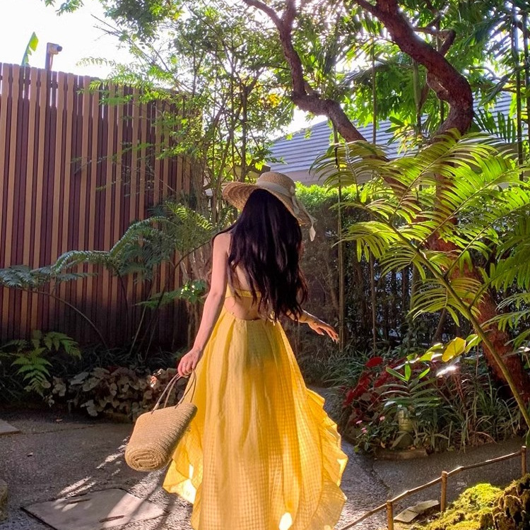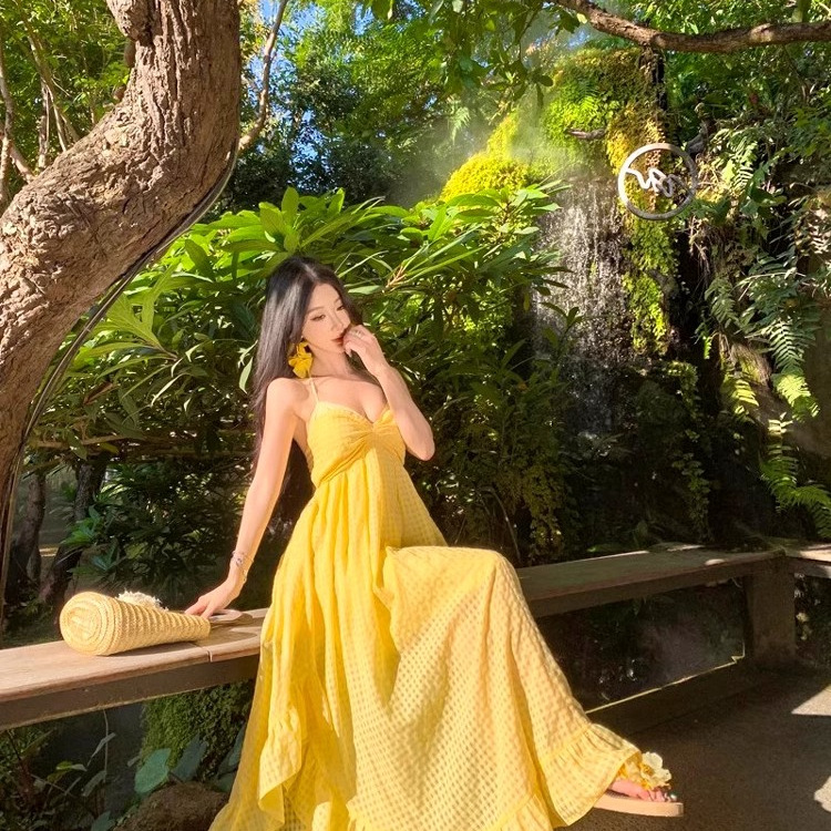 2025新款复古黄色露背吊带连衣裙女夏不规则三亚旅游海边沙滩长裙