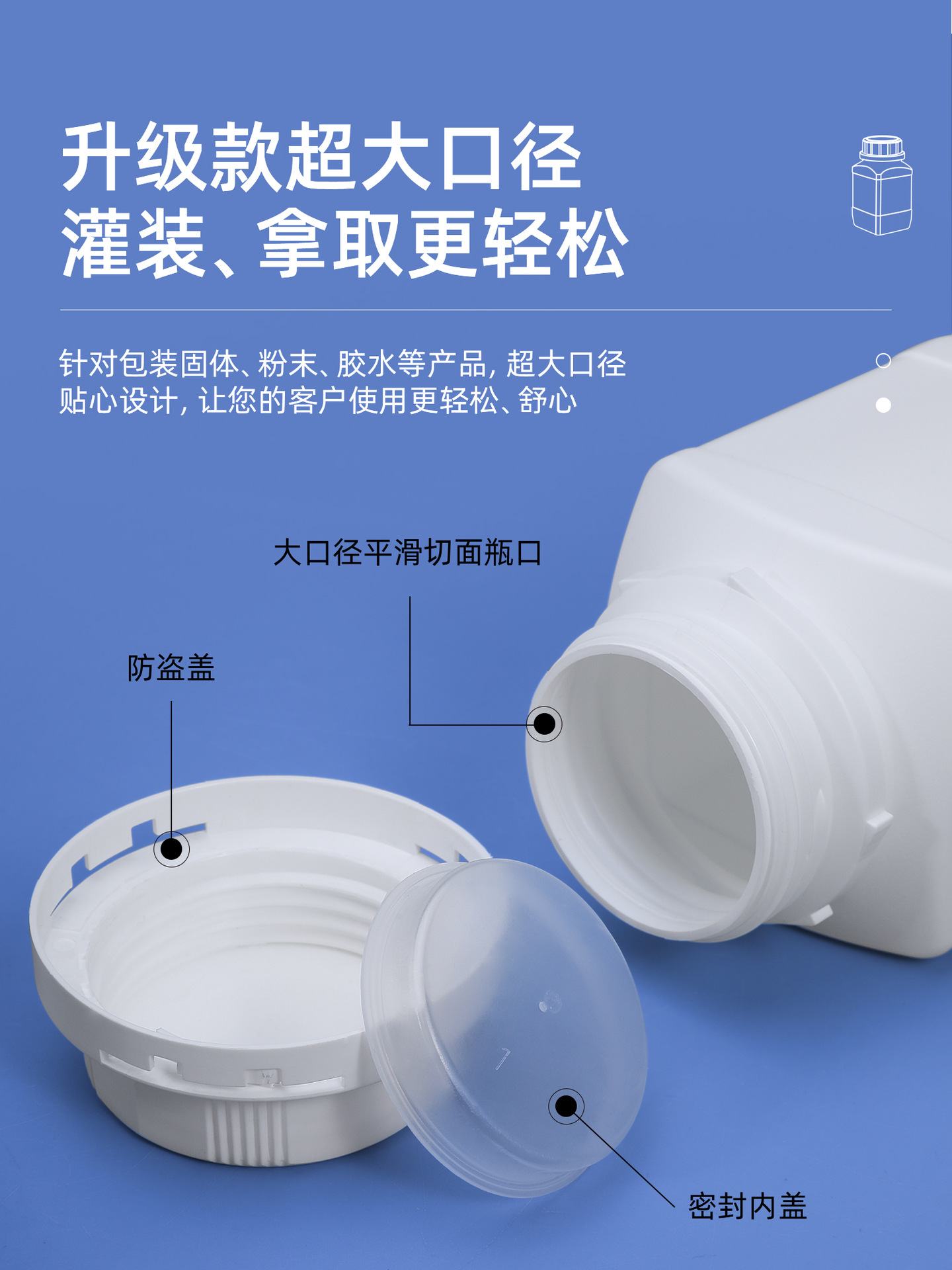 规格型号 | 1000ml半透明大口径配内盖无防盗圈 | | 规格型号 | 500ml白色大口径蓝盖配内盖无防盗圈 |