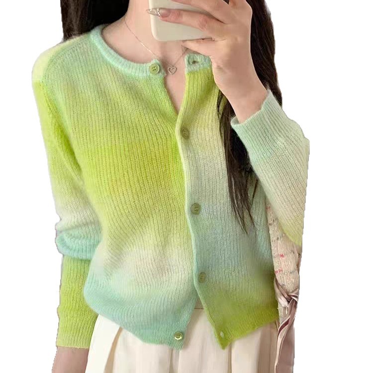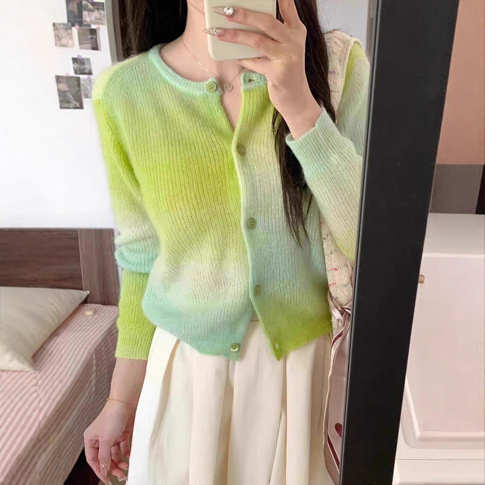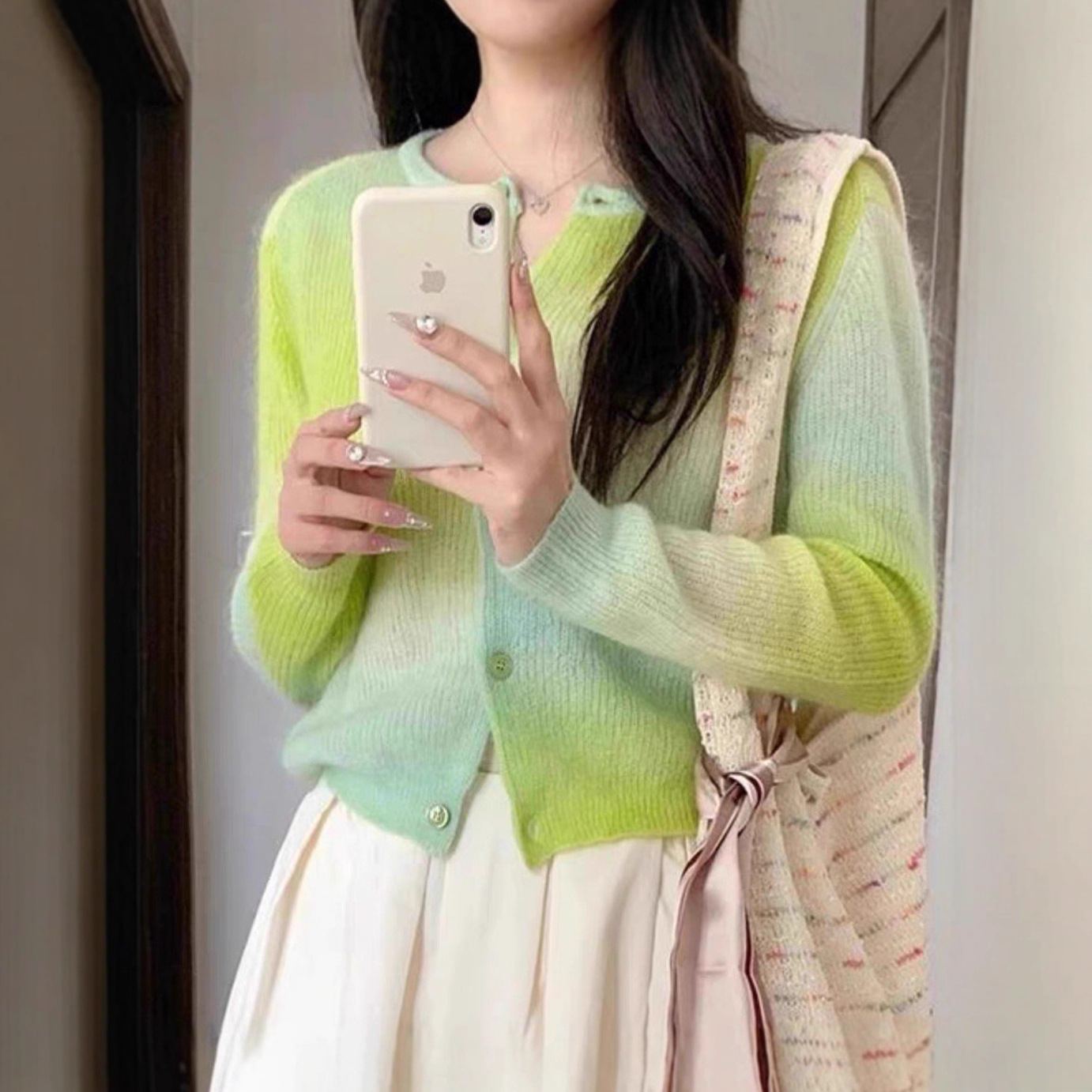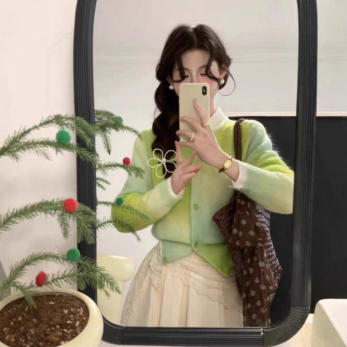 韩系渐变绿色长袖针织开衫女春秋季外搭慵懒宽松毛衣半身裙套装