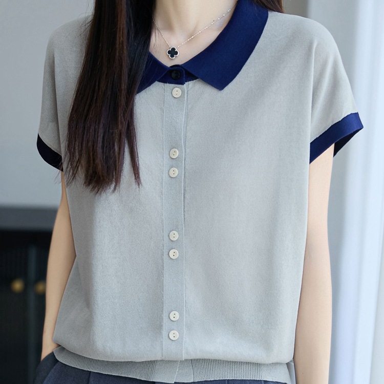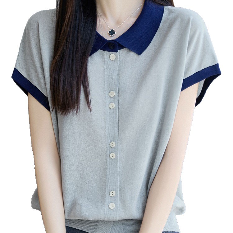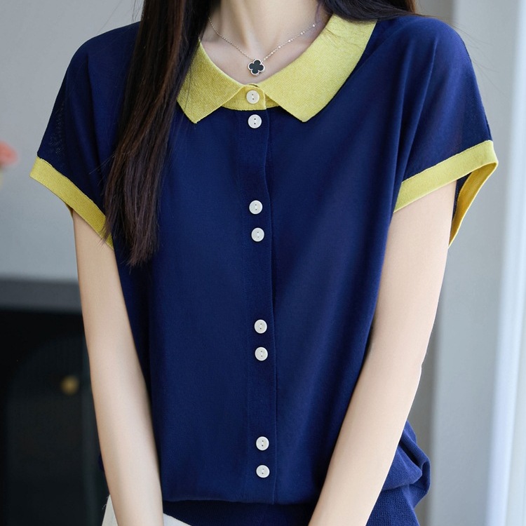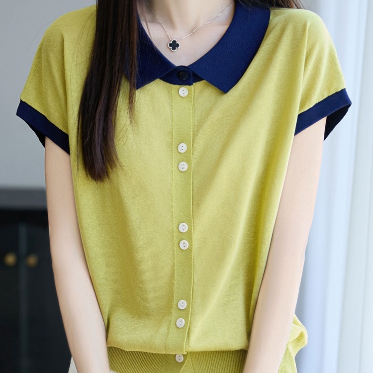 跨境重磅天丝双扣撞色翻领小飞袖开衫t恤女夏季薄款短袖打底外搭