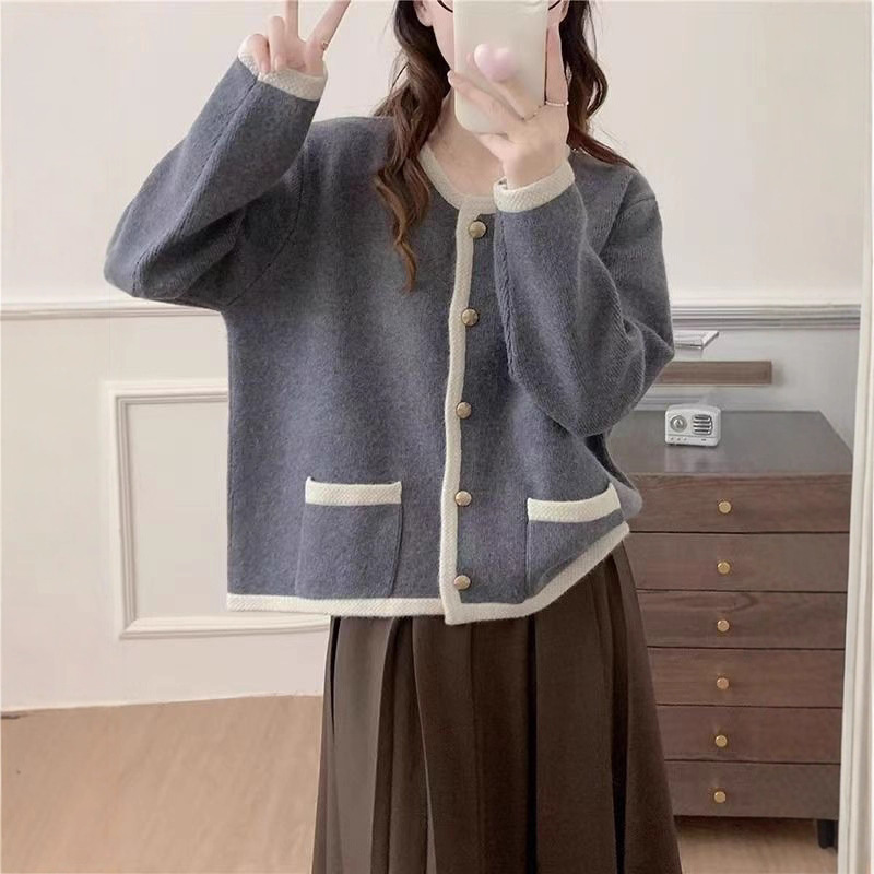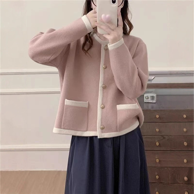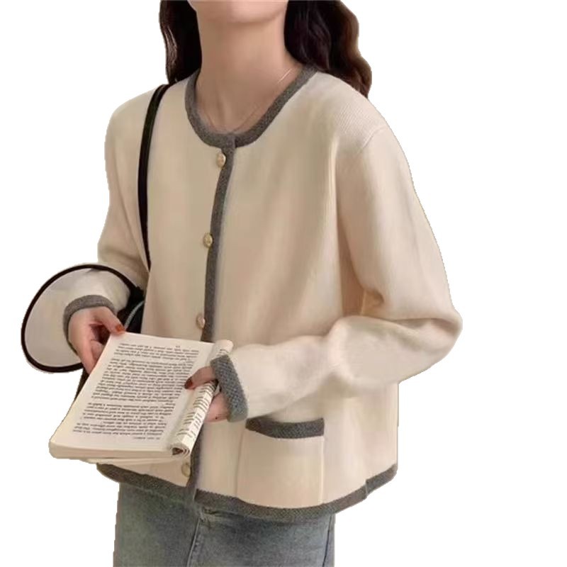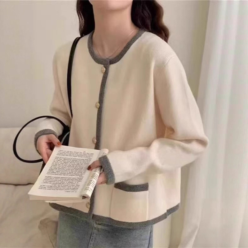 镶边撞色圆领单排扣简约气质针织开衫女春秋新款韩版减龄毛衣外套