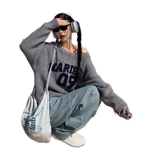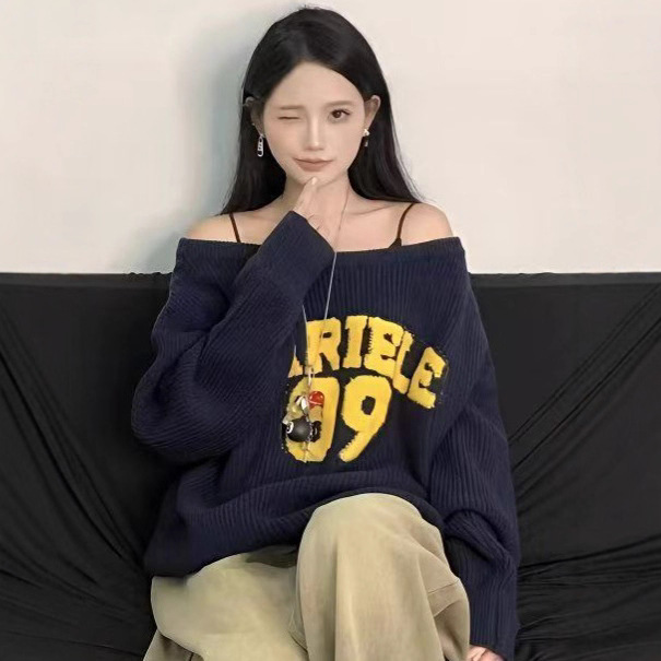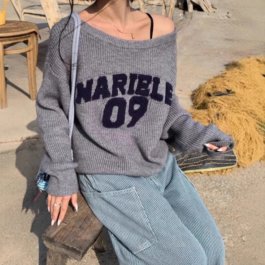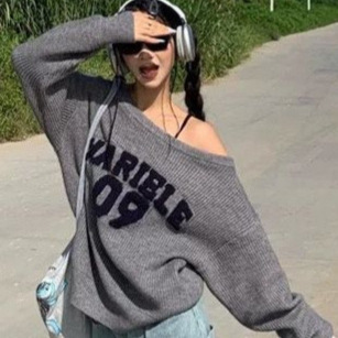 美式复古慵懒感斜肩毛衣女秋冬新款高级感宽松显瘦小众短款针织衫