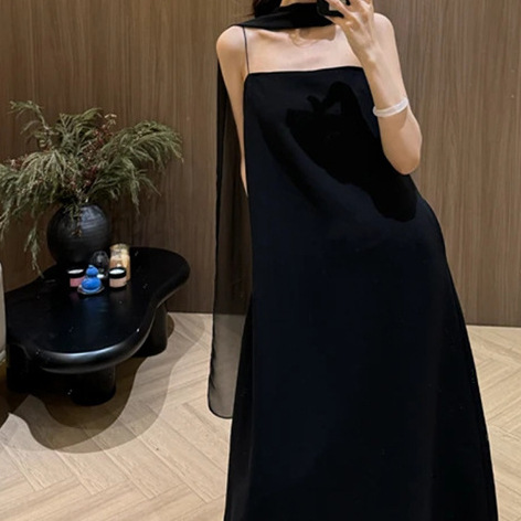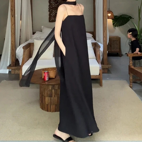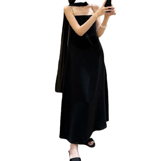 跨境醋酸配飘带抹胸吊带连衣裙夏季法式原宿风简约长裙女其它挂脖