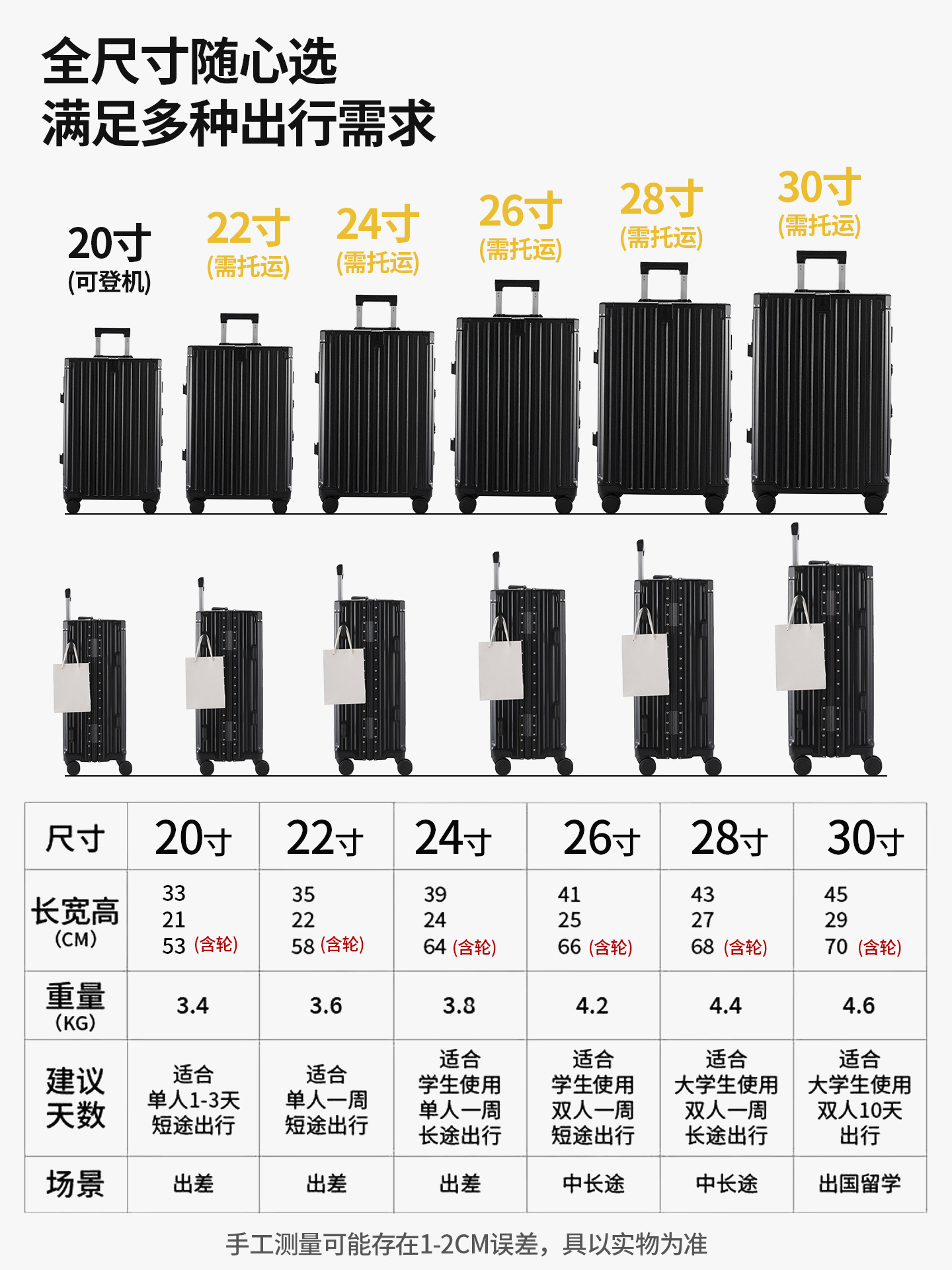 | 尺寸 | 26寸【长途旅行高中生选择】 | 尺寸 | 28寸【双人出行大学生选择】 |
