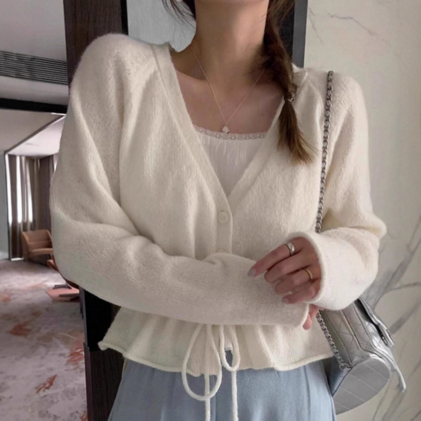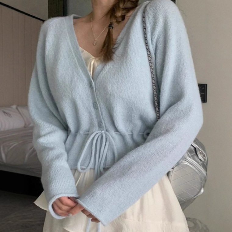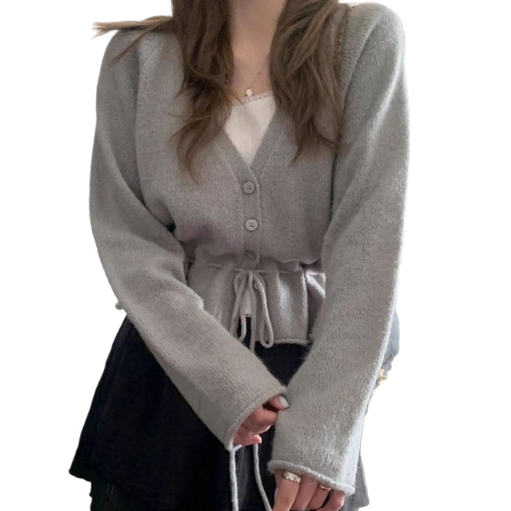 2025早秋新款外贸韩系风甜美风纯色V领系带收腰长袖针织衫毛衣外