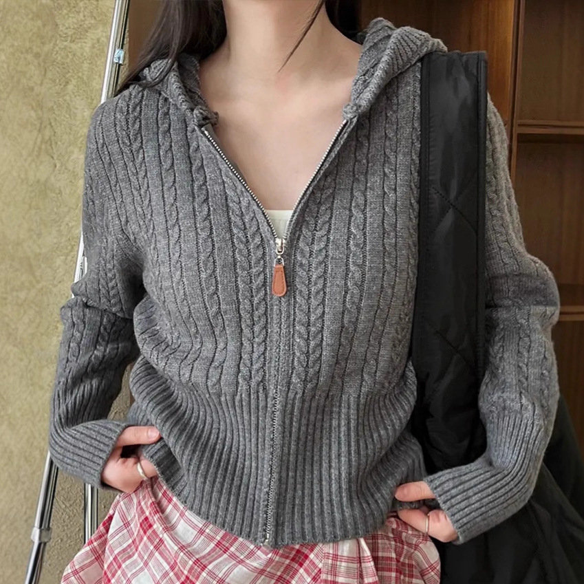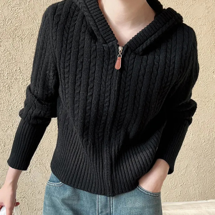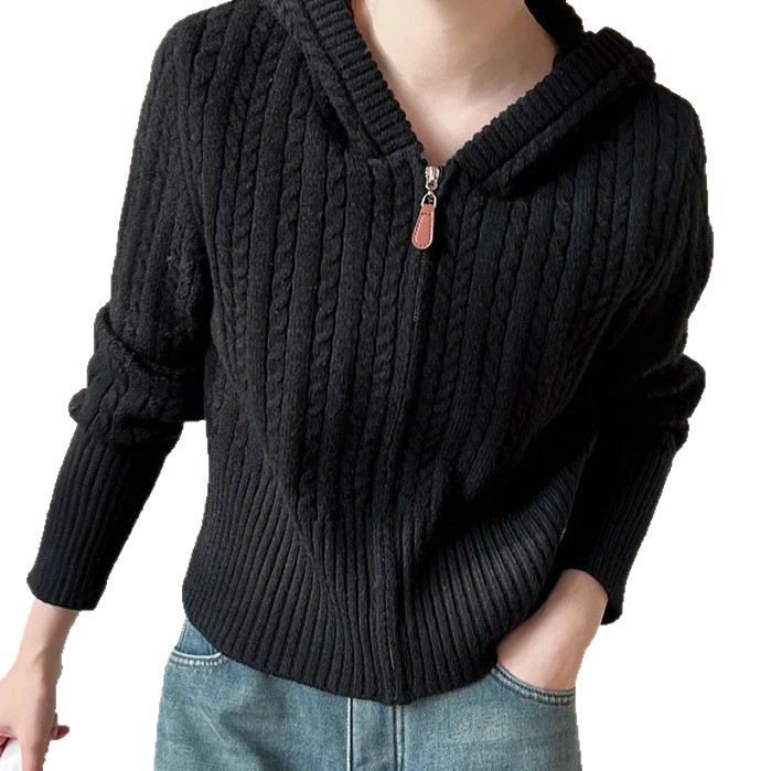2025韩系麻花毛衣开衫拉链连帽短款针织外套女温柔显瘦设计感上衣