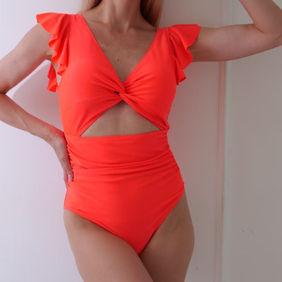 2025欧美泳衣女荷叶边保守连体泳衣胸前交叉镂空纯色露背泳衣女